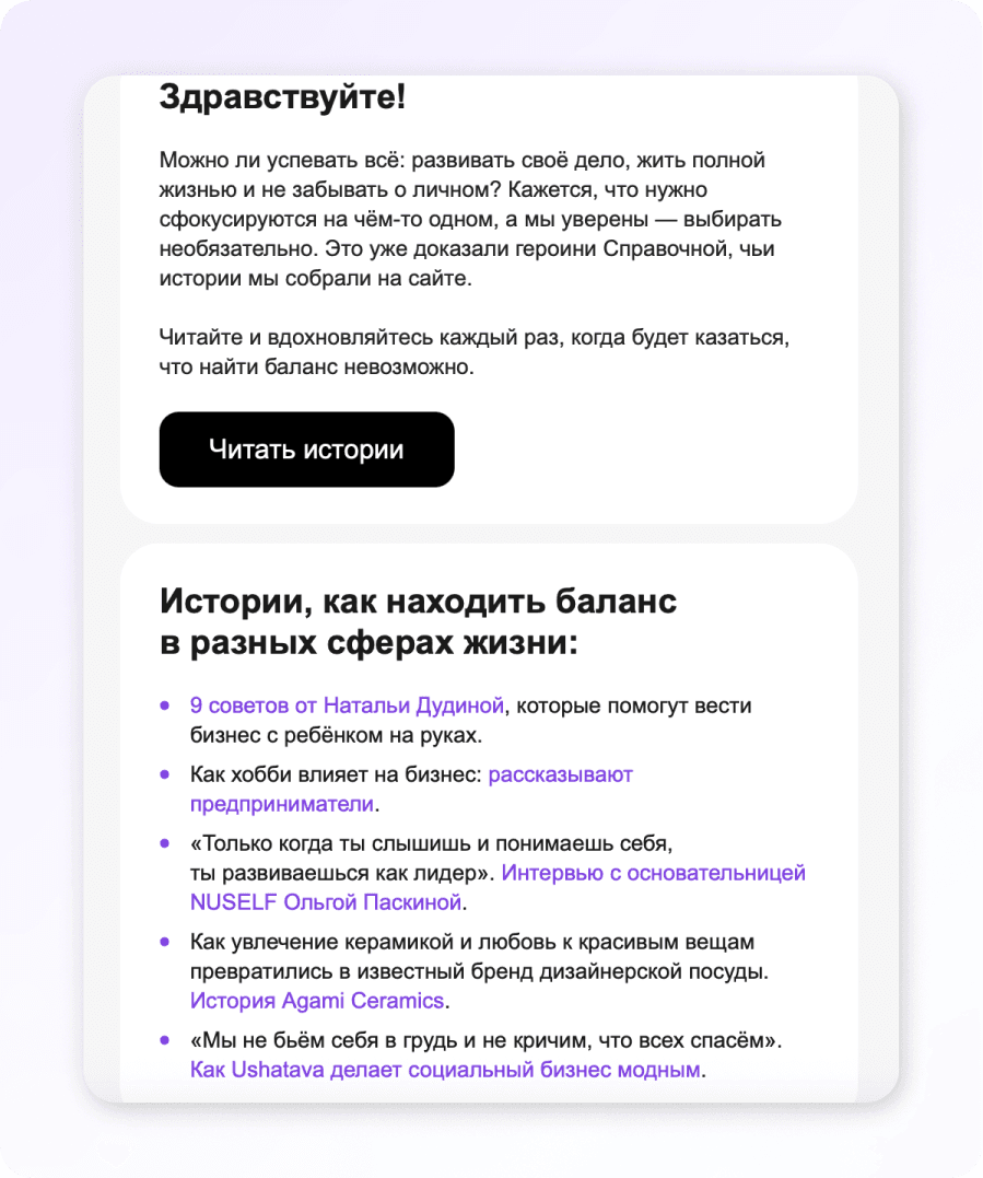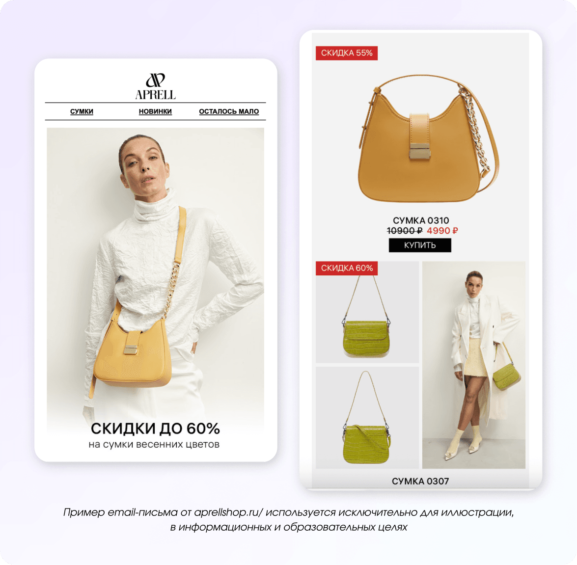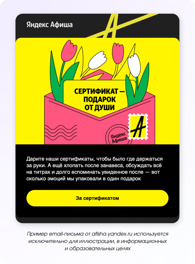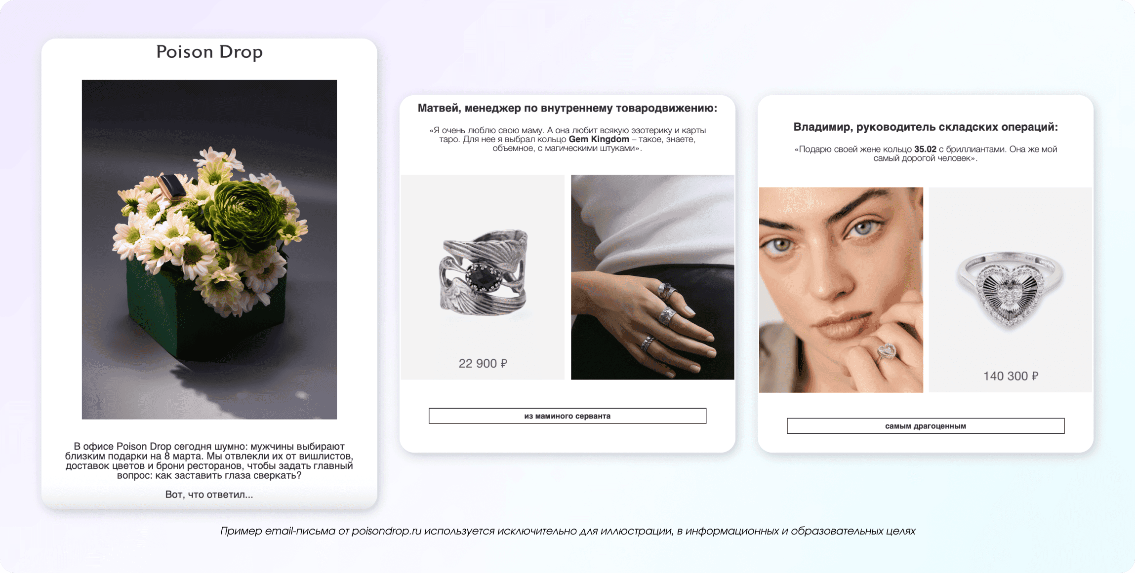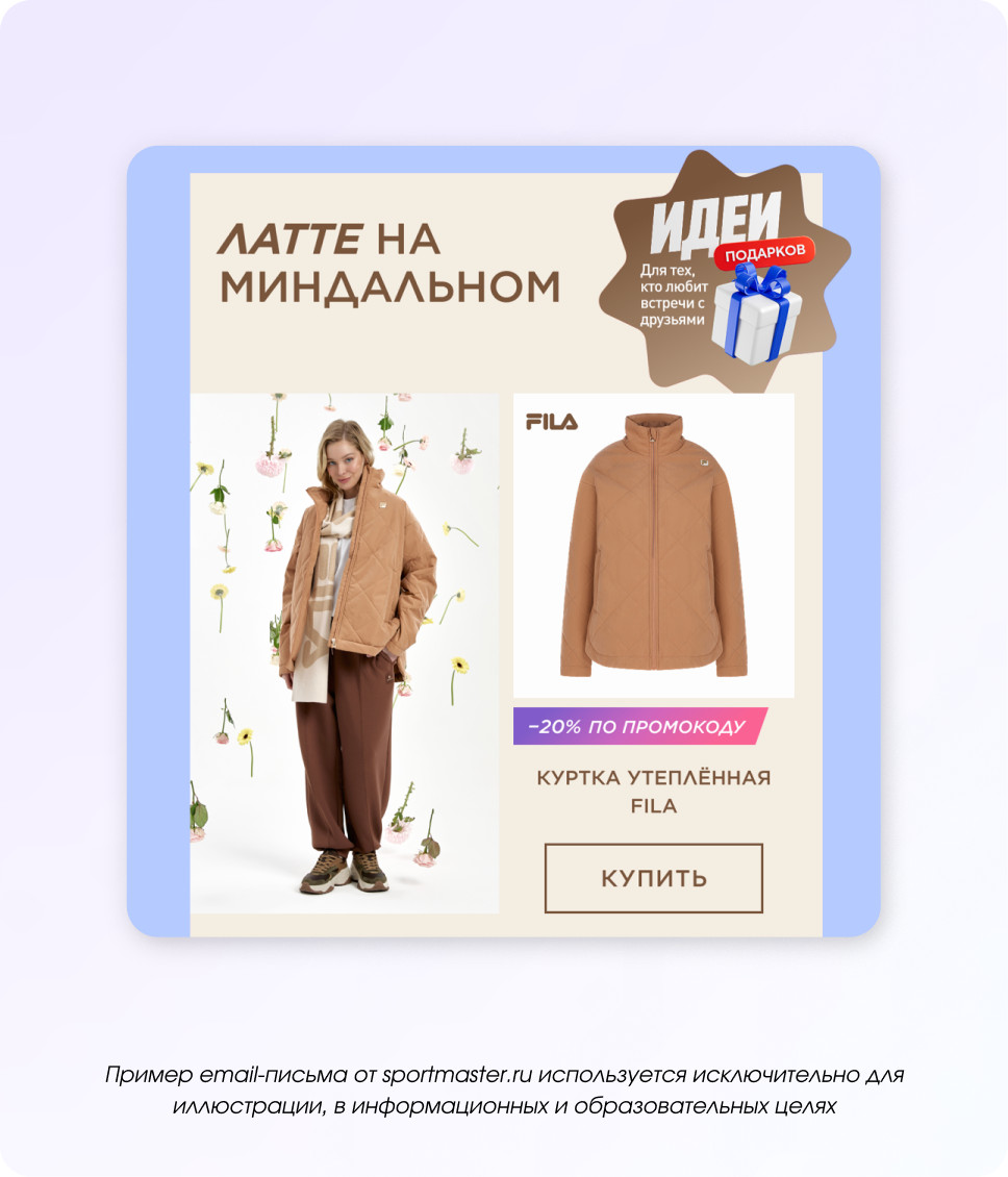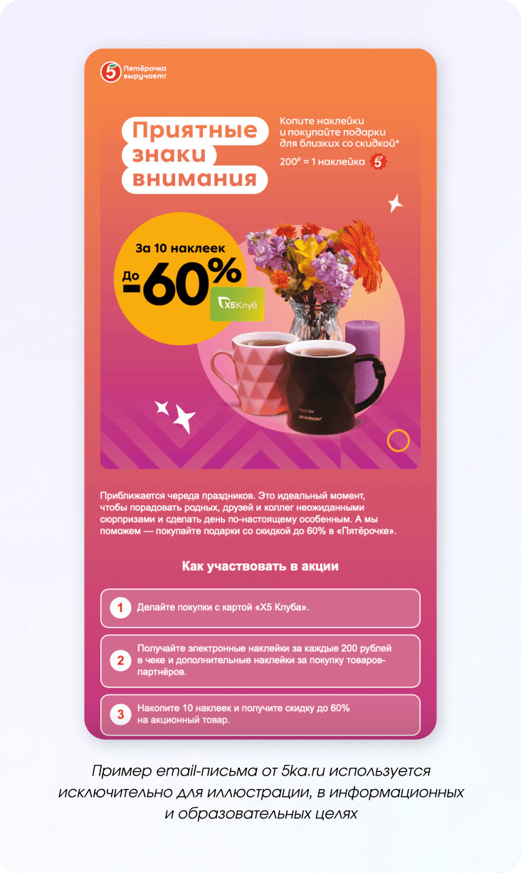 Всегда актуальная рассылка, которая используется каждый год. При этом возможны не прямые скидки, а интерактивный формат. Например, когда нужно собрать нужное количество наклеек. Маркетплейс товаров из-за границы предлагает значительные скидки от 25%. Причём рассылка начинается ещё в феврале. Учитываются сроки доставки, поэтому акция заканчивает действовать уже в начале марта. Акция со скидками всего на три дня — тоже повод для рассылки. Ограничение по времени замотивирует купить быстрее. Дизайн с цветами настраивает на нужное настроение. Возможно сделать подборку по потребностям и категориям: полезные, популярные, для путешественников. И подсказать, что эти подарки можно купить с кешбэком. Маркетплейсам выгодно делать подборки с женскими товарами: косметикой, одеждой, красивой обувью, аксессуарами. Главное, чтобы не уходить в гендерные стереотипы и делать предложение ненавязчиво. Вариант рассылки, которая объединяет сразу несколько приёмов: весенние скидки, ограничение по времени в два дня и идеи подарков. Вместо обычного списка товаров бренд оформил идеи подарков нестандартно — через личные впечатления команды. Причём подборкой делятся мужчины, которые выбирают украшения для женщин, и это добавляет формату живости и доверия. Дополняет всё аккуратная, эстетичная подача — в узнаваемом стиле бренда. В итоге получается не каталог, а история, за которой интересно следить. Косметический бренд предлагает готовые наборы для подарка. В письме используется персонализация: пользователя называют по имени, а также учитывают обычную сумму покупок. Идеи предлагаются именно под такой бюджет. К 8 марта хорошо работают рассылки с напоминаниями о подарках для любимых женщин. Такие сообщения вовремя подталкивают к покупке и упрощают выбор, особенно для тех, кто откладывает решение до последнего момента. Магазин техники даёт значимую скидку и предлагает варианты в разных ценовых категориях. Весна — естественный и близкий к празднику инфоповод, с которым легко поиграть креативно. Необязательно напрямую привязываться к дате: можно обыграть сезон, обновление гардероба или настроения. Например, бренд сумок сделал подборку моделей в «весенних» цветах и добавил на них скидки. Выглядит свежо, уместно и без шаблонных поздравлений. Сервис с обучающими курсами объединил начало весны и праздничный период в одно предложение — сделал специальные цены на обучение. Сезон здесь обыгрывается как время обновления и новых стартов, когда особенно хочется попробовать что-то новое или прокачать навыки. Такой контекст выглядит естественно и хорошо мотивирует записаться на курс. Праздничные рассылки подходят и для продвижения мероприятий. Например, театр запустил акцию со скидками на спектакли в дни перед 8 марта и рассказал об этом в письме. Чтобы подтолкнуть к быстрому решению, в рассылку добавили таймер с ограничением по времени. Такой приём создаёт ощущение срочности и стимулирует купить билет сразу. Праздник — это не только про подарки, но и про впечатления, совместный отдых и атмосферу. Поэтому в рассылках можно не продавать напрямую, а подсказывать идеи: куда сходить, где провести время или как устроить небольшой праздник для себя и близких. Например, авиакомпания предлагает не просто билеты, а готовые сценарии поездок — с маршрутами и подск