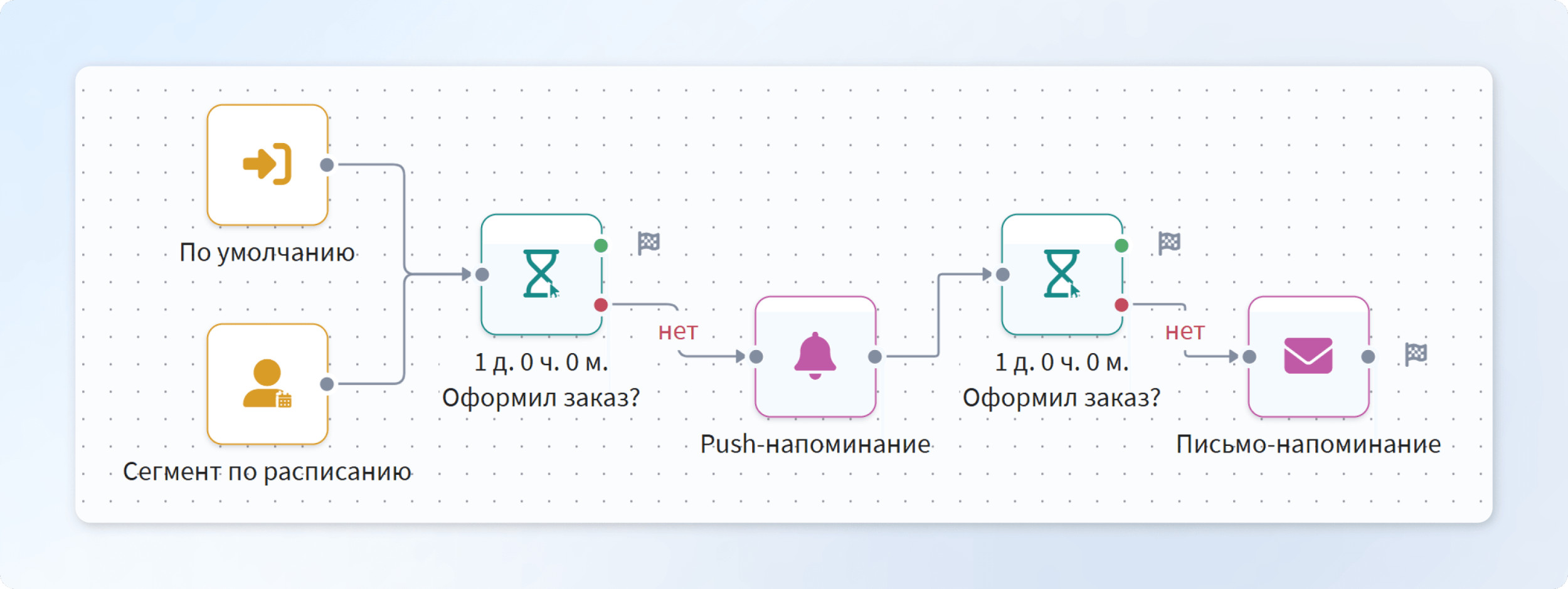 Корзина должна сохраняться автоматически на устройстве или в аккаунте. Пользователь может закрыть вкладку и вернуться к покупкам через пару дней. Но заказ при этом должен оставаться нетронутым, чтобы путь продолжался с того же места. Исчезновение содержимого корзины — одна из самых досадных ошибок. Клиент уже потратил время на выбор товаров, и ему придётся начинать всё сначала. Это вызывает раздражение и чувство потери контроля над процессом. В результате пользователь с большой вероятностью покинет сайт, даже если был настроен совершить покупку. Краткий ответ: да, их нельзя считать разовым проектом. Технологии не стоят на месте, появляются новые интерфейсные стандарты, а поведение пользователей меняется. Периодический анализ даёт широкую картину того, где возникают препятствия, и предотвращает накопление мелких недочётов. Для оценки используются: Продуманный интерфейс способен сократить число брошенных корзин. Но даже безупречный UX не гарантирует, что все пользователи доведут оформление до конца: кто-то отвлёкся и закрыл вкладку, кто-то ушёл сравнивать цены и условия у конкурентов, а кто-то отложил покупку и забыл о ней. Такой разнородный набор причин возможен даже на самых удобных сайтах. Чтобы не потерять клиентов окончательно, используется автоматизация — один из важнейших компонентов управления маркетингом. Она создаёт условия, при которых пользователи получают своевременное напоминание о незавершённом заказе: Автоматизировать цепочки уведомлений и другие триггерные коммуникации вам поможет маркетинговая платформа Altcraft. Здесь вы можете настроить многоступенчатые сценарии взаимодействия на основе поведения пользователей. Например, если клиент добавил товары в корзину, но не оформил покупку в течение заданного времени, система отправит напоминание в подходящем канале: email, SMS, push или мессенджере. Последовательные цепочки автоматических сигналов срабатывают в нужный момент. Достаточно собрать логику, выбрать нужные каналы, настроить контент и условия отправки — и сценарий готов к работе.