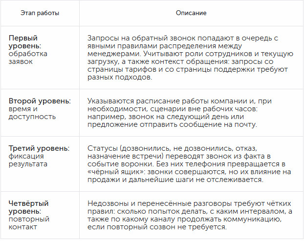 Всплывающее окно. Появляется спустя заданное время после загрузки страницы, при определённой глубине прокрутки или после конкретного действия. Формат уместен как приглашение на консультацию, когда пользователь уже успел ознакомиться с частью контента. Встроенный блок. Размещается непосредственно на странице: например, рядом с тарифами, описанием схемы внедрения или частыми вопросами. При грамотном использовании становится частью интерфейса и логичным продолжением текущего сценария. Закреплённая кнопка. Небольшой callback-виджет, постоянно находящийся в поле зрения. В типовом варианте представляет собой иконку телефонной трубки в углу экрана. Она не отвлекает от чтения и остаётся доступной, когда пользователь готов к звонку. Строка в шапке или подвале сайта. Подходит для ситуаций, когда телефон выступает базовым каналом связи и не требует отдельного сценария показа или акцента. Ссылка может вести на отдельную страницу с формой или открывать поп-ап по клику. Содержание и уместность callback-формы способны повлиять на уровень конверсии в заявку. Здесь стоит обратить внимание на такие правила: Если обратный звонок не рассматривается как полноценный этап маркетинговой воронки, он рискует остаться изолированным эпизодом, который не участвует ни в аналитике, ни в управлении. Основную роль здесь играет то, насколько последовательно выстроены процессы и данные вокруг телефонии.