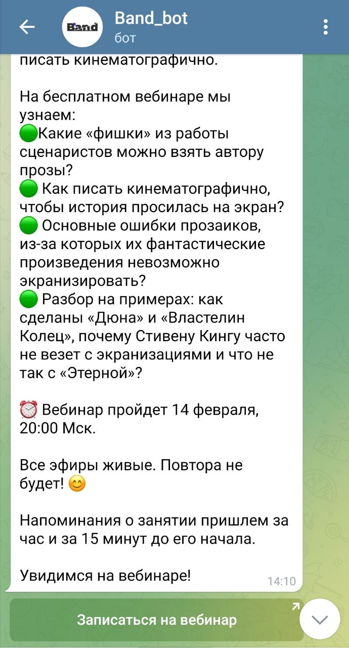 Мессенджер не планировался для коммерческих целей, а на сайте до сих пор есть обещание, что рекламы там не будет. В 2021 году реклама появилась. До официального запуска рекламы продвижение тоже было: каналы рекламировали друг друга, а бренды продвигали свои продукты через каналы. Каналы — главное отличие и преимущество Telegram перед другими мессенджерами. Этот инструмент заменяет ленту соцсетей и даже корпоративные блоги. В каналах доступные комментарии и реакции, что похоже на соцсети. 82% пользователей заходят в каналы за новостями, 43% — узнать новости своей сферы, а 59% за развлечениями, поэтому перспективы для маркетинга здесь безграничные. Для бизнес-целей у мессенджера есть отдельное приложение WhatsApp Business, которое также бесплатное, но с дополнительными бизнес-функциями. Мессенджер предлагает создавать каталоги товаров и услуг с описанием, ценой, ссылкой на сайт и кодом товара для быстрого поиска. Здесь же клиент задаёт вопросы компании. С функцией автоматизации ответы в WhatsApp быстрые, также есть шаблоны. Каталоги хранятся в бизнес-профилях компаний, что упрощает поиск для клиентов. Мессенджер поддерживает бизнес-профили и предлагает рекламу, которая здесь похожа на рекламу в электронной почте. Пользователь видит в отдельной строке лого компании и предложение. Также Viber продвигает услугу звонков на телефоны операторов по сниженным тарифам. Чат-бот — инструмент для автоматизации простых действий на сайте или в мессенджере. Робот берёт на себя рутину и повторяющиеся активности: сбор заявок, ответ на вопросы по шаблону, рассылку информации и другие. Простые боты делают в конструкторах, для сложных придётся нанять разработчиков. Чат-бот отвечает быстро 24/7 и не упускает клиента из-за несовпадения рабочий часов сотрудника с запросом клиента. Пример. Клиент хочет записаться в салон красоты на следующий день и ищет варианты накануне вечером. Клиент пишет вопрос в три салона. От двух ответа нет — рабочий день менеджеров закончился. Третий подключил чат-бот, который автоматически записывает клиента на свободное время. Клиент идёт в этот салон. Боты полезны для распространения контента, обучения, развлечения, напоминаний, формирования привычек, оформления заказов, назначения встреч и работы техподдержки. Есть простые боты для одной функции — их монетизируют или публикуют там рекламу. Например, боты для конвертации валют, проверки текста, напоминаний. В мессенджерах доступные индивидуальные и групповые чаты. Рассылка в индивидуальный чат персонализированная и точно в цель. Групповые чаты полезны для сегментации аудитории, рассылки там — экономия времени, ведь не нужно отправлять каждому пользователю отдельное сообщение. Внутренние инструменты рекламы есть у Telegram и Viber, для WhatsApp — только переходы в мессенджер из рекламы в Facebook и Instagram. Реклама в Telegram появляется в каналах, Viber показывает рекламу в списке чатов. Канал заменяет соцсети и корпоративные блоги — формат с текстом и картинкой упрощает оформление текста, нет вёрстки, как на сайтах. Аудиосообщения и видео в каналах дополняют текстовый контент. Скорее дополнение к основному продвижению в мессенджерах. По данным Viber в месяц пользователи отправляют более миллиарда стикеров. Оригинальные стикеры от бренда — плюс к узнаваемости и бесплатное продвижение. Автоворонки — настр