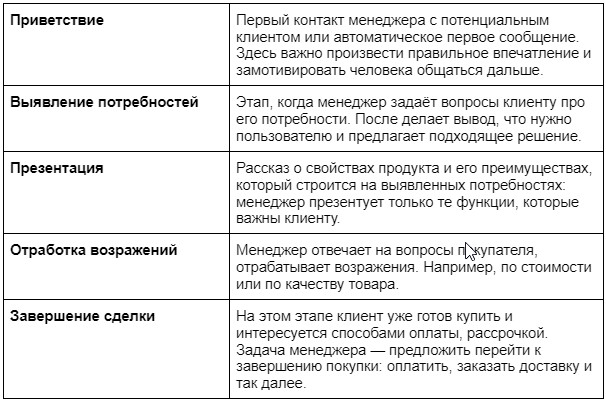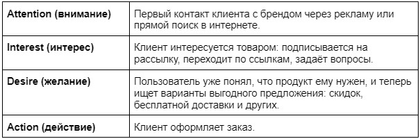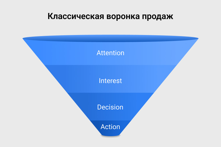 Для прозрачности процесса и упрощения аналитики используется воронка продаж — концепция, которая описывает все шаги клиента на пути к конверсии. Компания выбирает и адаптирует под себя: классическую схему из пяти шагов покупки, модель AIDA, методику СПИН и другие или создаёт свой вариант.