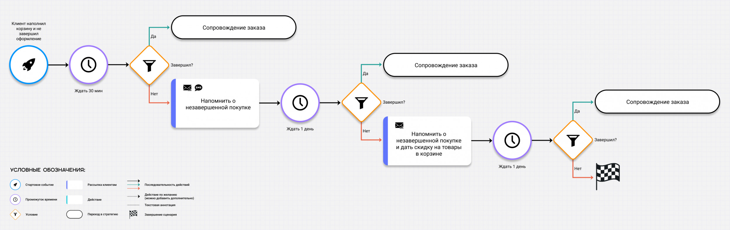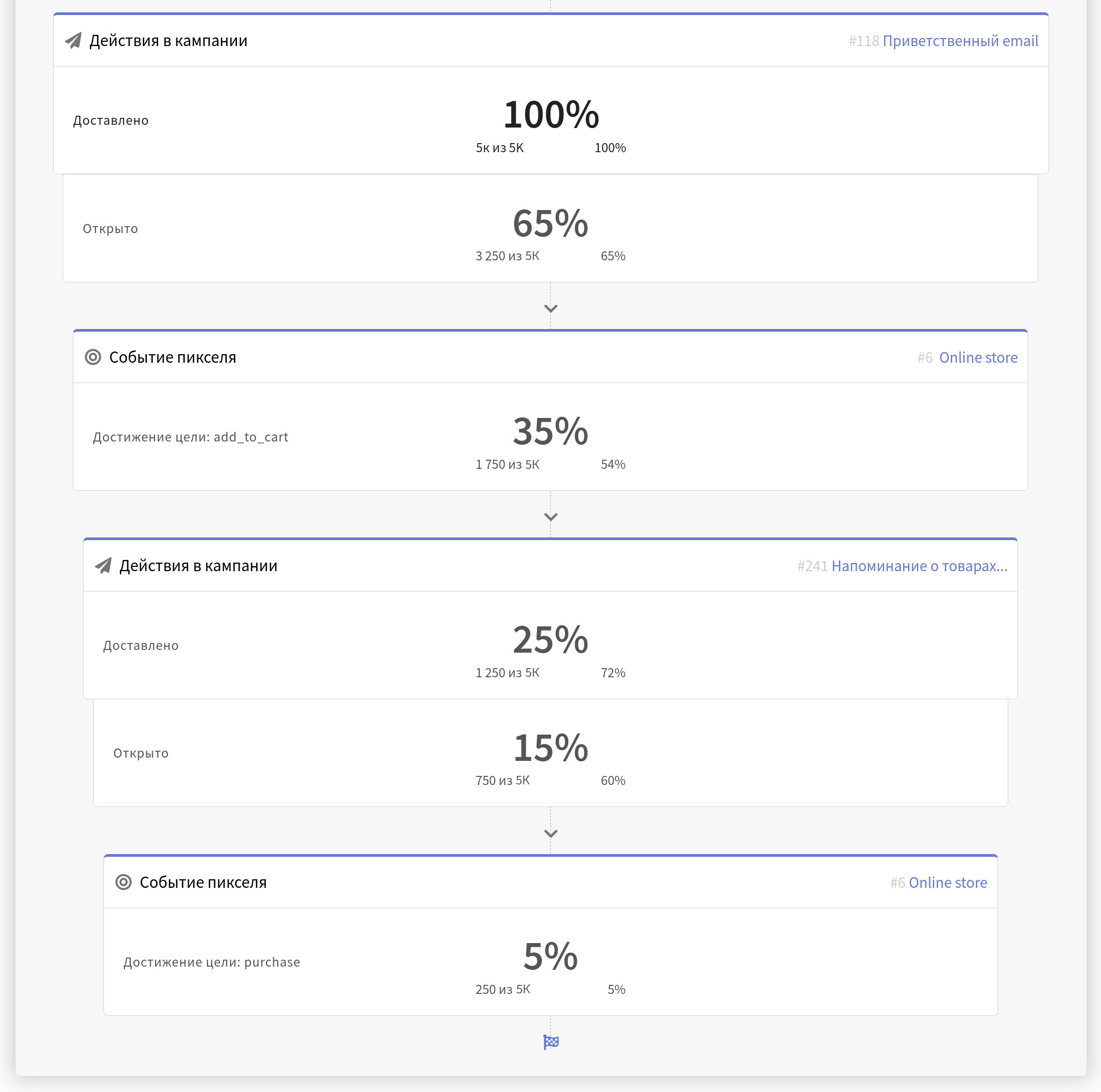 Каждая компания выбирает модель, которая больше всего подходит под потребности бизнеса, и трансформирует этапы под свои процессы. Не бывает универсальных методов, поэтому бренды не только адаптируют под себя существующие модели маркетинговых воронок, но и разрабатывают свои. В некоторые схемы включают послепродажный сервис, дополнительные и кросс-продажи, которых нет в классических вариантах. Создадим кастомный вариант воронки продаж за шесть шагов: 1. Сбор данных Соберите информацию об аудитории, которая должна попасть в список лидов. Определите, через какие каналы приходят клиенты, как ведут себя на разных ресурсах, какие у них потребности, возражения. Дальше запланируйте воронку под конкретный тип аудитории, а не под всех сразу. Выберите одну из существующих моделей, исключите этапы, которые не важны в вашей компании и добавьте недостающие. 2. Определение целей для воронки Обозначьте, какую конверсию вы хотели бы получить от всей воронки и также показатели для промежуточных этапов. Модель делят на верх, середину и низ. Укажите, сколько пользователей предположительно должны доходить до каждой ступени. 3. План работы Определите действия на каждом шаге воронки. Например, в начале это может быть запуск рекламной кампании. В середине — уточняющий звонок менеджера или письмо-напоминание о покупке, если клиент оставит свой email. В конце — предложение бесплатной доставки или бонусов. 4. Создание контента для каждого шага Для автоматических воронок — это, например, шаблоны рассылок. При работе менеджеров подготовьте скрипты, материалы, которые продажники будут отправлять клиенту для детального знакомства с продуктом. 5. Настройка воронки продаж Маркетинговая воронка работает: Полуавтоматические и автоматизированные воронки продаж требуют настроек в специальном сервисе, но потом технологии сэкономят время сотрудников и ускорят коммуникацию с клиентом. 6. Запуск воронки, анализ и оптимизация Когда воронка заработала, за ней важно следить и улучшать. Регулярно измеряйте показатели на каждом этапе и быстро реагируйте на изменения. Только так модель принесёт ожидаемый доход. Для оптимизации берите обратную связь от пользователей по процессу продаж, анализируйте этапы воронки. Воронка необязательно будет простой: клиент пришёл на сайт, добавил в корзину товар и сразу оформил заказ. Часто путь до покупки дольше и сложнее. Пример такой воронки: Платформа поддерживает омниканальный маркетинг, поэтому собирает информацию о разных этапах воронки продаж в едином профиле. Как автоматизировать путь клиента из примера выше: Весь процесс продвижения пользователя по воронке продаж автоматизируется с Altcraft Platform через сценарии и другие инструменты. Рассылки из единого окна сервиса через Push, email, SMS и мессенджеры расширяют возможности, делают клиентский путь полностью прозрачным и контролируемым. Для отслеживания эффективности процесса используется отчёт «Воронка», который отображает показатели всех действий внутри стратегии. Визуализируются все шаги воронки продаж: количество клиентов и процент конверсии. Воронка продаж — модель пути клиента от первой встречи с брендом до покупки. Продажи с таким подходом становятся прозрачными и управляемыми: компания начинает контролировать каждый этап сделки, следить за работой менеджеров и 