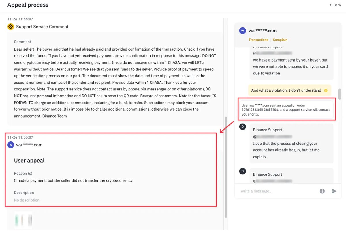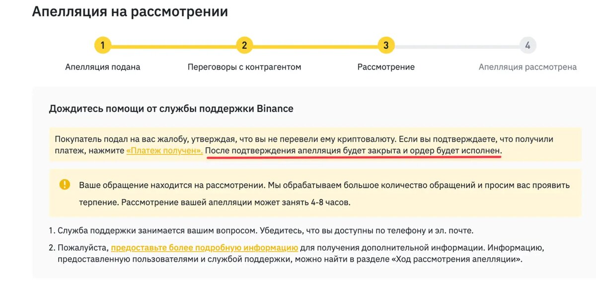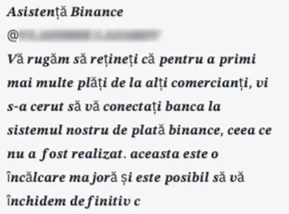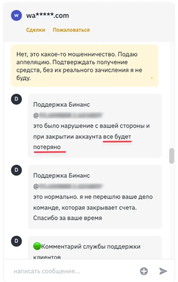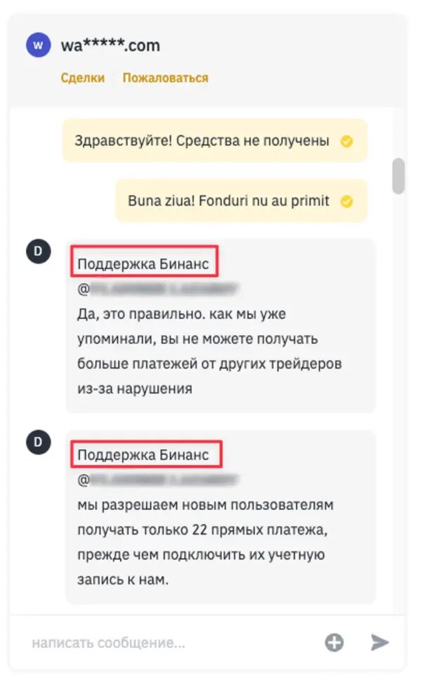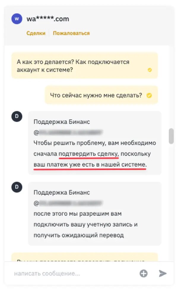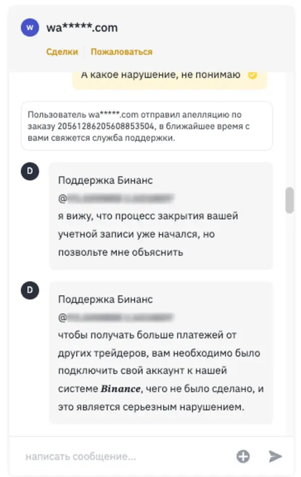 Мошенник в чате сделки маскируясь под сотрудника тех.поддержки Binance пишет о том, что вы нарушили правила Binance и ваш аккаунт будет деактивирован. Он утверждает, что Вам следует подтвердить получение средств по сделке и вам будут даны инструкции как избежать блокировки.