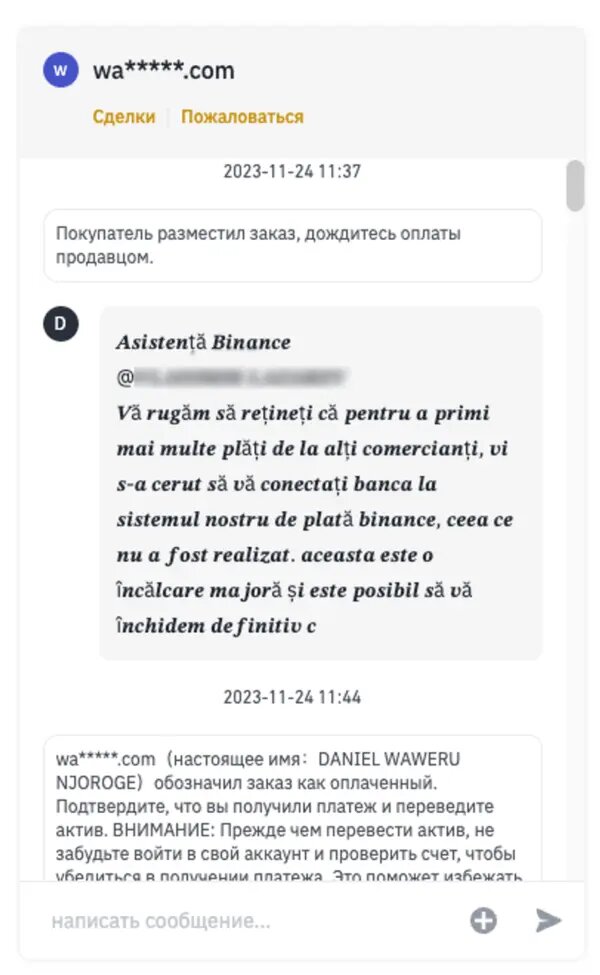 В случае, если вы подтверждаете получение оплаты, ваша криптовалюта разблокируется для мошенника. Он ее выводит с платформы и вам остается разбираться уже с реальной тех.поддержкой. Как-то сотрудник AML Crypto решил поменять криптовалюту через P2P сделку на Binance с выводом на банковскую карту. Первым шагом стало изучение разницы курсов на покупку и продажу токена USDT. Разница между лучшими ценами заявок оказалась существенной — 0,25 MDL ($0,014 за каждый токен). Поэтому мы решили разместить свое объявление. Мы никуда не спешили в обмене криптовалюты и задачей ставили исключительно выгодные условия обмена криптовалюты. Так мы разместили свое объявление о продаже криптовалюты. Достаточно быстро нашелся покупатель нашей криптовалюты. Покупатель инициировал сделку по нашему объявлению. И им оказался мошенник. Сразу же после инициированной сделки, мошенник под видом «Псевдо-сотрудника тех поддержки Binance», пишет нам о нарушении правил пользования Binance. А так как ответа от нас не поступило, мошенник переводит сделку в статус «Оплачено». Но так как мы никак не отреагировали на это сообщение, злоумышленник решает, что возможно мы не увидели сообщение. Поэтому указывает, что якобы он сделал банковский перевод по нашей сделки. Вероятнее всего мошенники считают, что мы отреагируем на сообщение и они продолжат разыгрывать спектакль с «псевдо» тех.поддержкой. Ведь, действительно, увидеть сообщение что вот-вот ваш аккаунт заблокируют, а все что вам нужно сделать, чтобы это избежать — это закрыть сделку. Обратите внимание также, на одну особенность, как написан текст: Когда Binance распознает мошеннический умысел, система предупреждает клиента о риске: Злоумышленник в начале каждого сообщения пишет «Поддержка Бинанс», чтобы ввести в заблуждения пользователя, с кем он общается: Чтобы у вас было меньше времени и больше стресса, мошенники переводят в режим аппеляции. Они обозначают, вы не отпускаете криптовалюту, а они якобы все оплатили. Злоумышленники понимают, что Binance не подключится мгновенно и есть возможность вас «дожать». Тем временем, на вас начинают оказывать эмоционально давление: Сотрудник AML Crypto решает им подыграть, чтобы понять, что будет дальше: В этот момент для пользователя правильно подавать встречную апелляцию в сделке, прилагать все доказательства о том, что средства вы не получили. И ни в коем случае не подтверждать получение средств, если вы их не получили. В нашем случае доказательство было предоставлено в виде объяснения обстоятельств, акцентировании, что пользователь притворяется сотрудником тех поддержки, а также видео демонстрация, где видно, что на указанную карту зачисления не было. Скорее всего мошенники и далее будут пытаться вас убедить, что они являются сотрудниками тех поддержки Binance, вызывая у вас страх, что если вы сейчас не подтвердите получение средств от них, ваша криптовалюта будет заблокирована, как и сам аккаунт. Мошенники попробовали еще ввести в данную ролевую игру «Службу поддержки клиентов», но нам это стало не интересно: Мы закончили этот диалог фразой о том, кем мы являемся и предоставили мошенникам наш сайт. Мошенники оказались любопытными людьми, они действительно зашли на наш сайт :) Смотрели на нас через VPN региона Кения (Найроби), с монитора с разрешением 1920×1200 пикселей, с операционной системой Windows 10. ClientID: