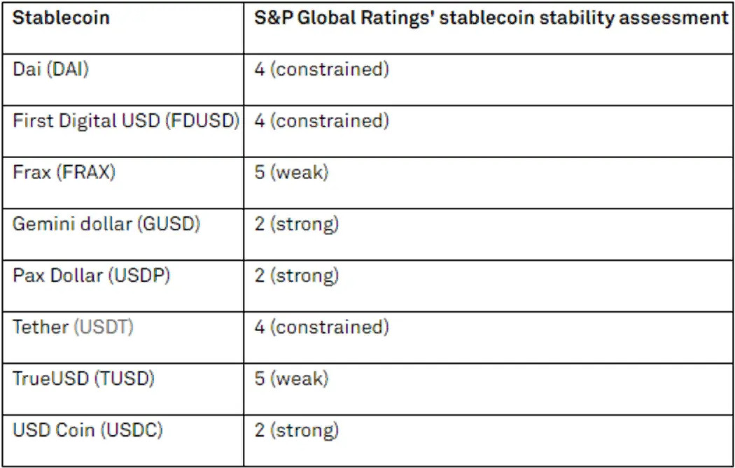 Оценка S&P Global Ratings создаётся за счёт тщательного изучения рисков качества активов, таких как кредитные риски, риски рыночной стоимости и депозитарные риски, а также оценки требований к избыточному обеспечению и механизмов ликвидации. Оценкам подверглись основные стейблкоины по мнению компании S&P Global Ratings: