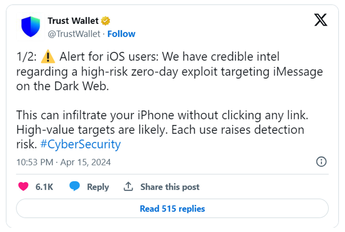 Trust Wallet заявляет, что обладает «подлинной информацией» о наличии эксплойта нулевого дня, направленного на iMessage и обнаруженного на черных рынках. Этот эксплойт вызывает особую озабоченность, поскольку он, как утверждается, позволяет хакерам взломать iPhone без участия пользователя, например, через переход по вредоносной ссылке. Это делает его особенно опасным, так как пользователи могут не осознавать, что их устройства подвергаются атаке.