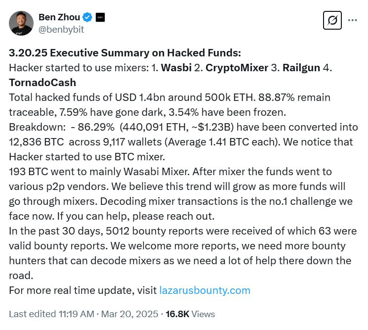 Глава ByBit Бен Чжоу сообщил о новых подробностях расследования крупнейшего криптовалютного взлома на $1,4 миллиарда. Хакеры, связанные с инцидентом, начали активно использовать миксеры, чтобы скрывать украденные средства: