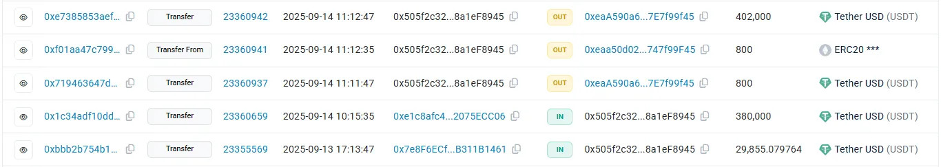 В строке 1 — крупная транзакция на 402,000 USDT, в которую входят и оставшиеся наши средства.