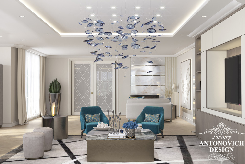 Дизайн гостиной в проекте дома в Германии. В благородную палитру бежевого и айвори мы добавили яркие, экспрессивные оттенки аквамаринового и золотого оттенков, создав уникальный авторский дизайн.