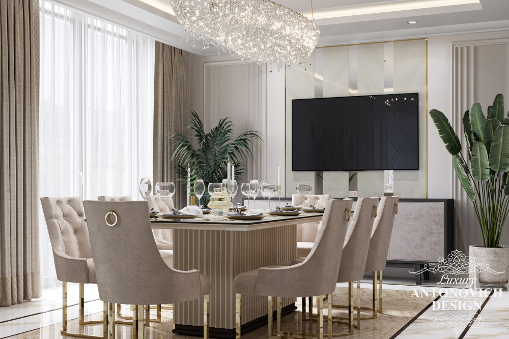 В дизайн-проекте столовой, благородную бежевую палитру мы разбавили акцентами из темного дерева, шпонированными панелями с зеркальными вставками, живыми растениями, авторской дизайнерской люстрой из хрусталя и мебелью из лучших коллекций мировых брендов.
