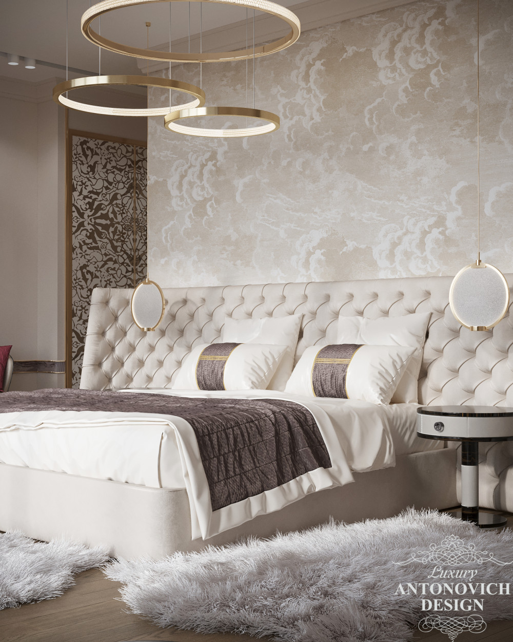 В дизайне мастер-спальни палитра кремовых, пудровых тонов - идеально сочетается с оттенками бордо и цветом горького шоколада, дополненных декором из латуни и отделкой из белой кожи. А изящная фреска над изголовьем кровати добавляет акцент воздушной легкости и очарования.