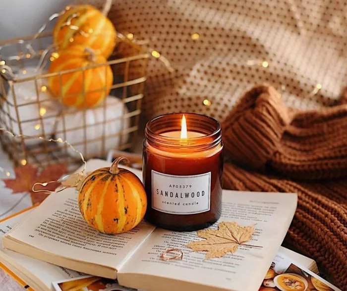 - Детали в дизайне- листья, свечи, книги, уютные текстуры (шерсть, дерево, плед);- дымящийся кофе, тыквы, яблоки;- иллюстрации: дождь, зонтики, сапоги, окна с каплями.