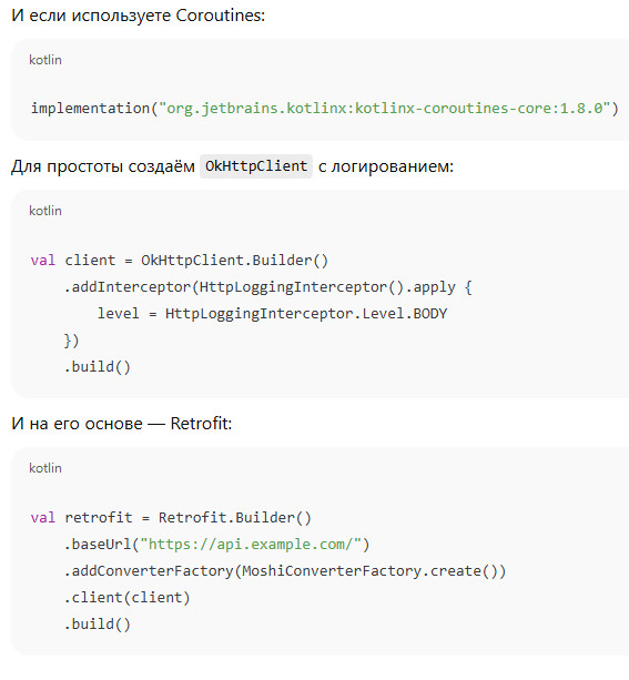 Несмотря на появление альтернатив (например, Ktor), связка OkHttp + Retrofit + Coroutines остаётся самой стабильной и предсказуемой. Причины просты: