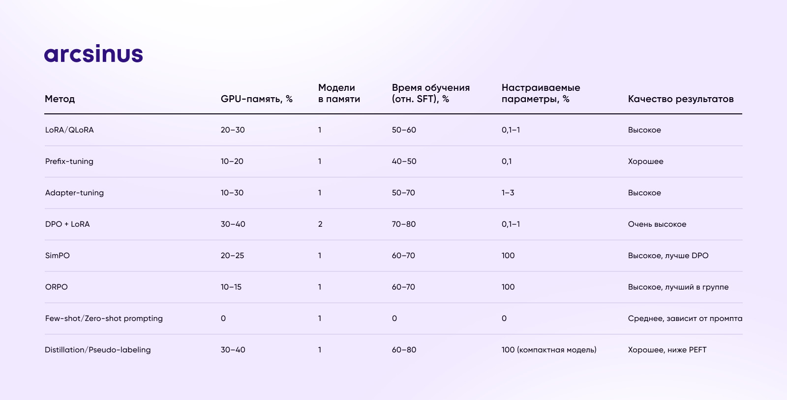- Число настраиваемых параметров — сколько весов модели обновляется от десятых долей процента (LoRA, prefix-tuning) до 100% (полное SFT).