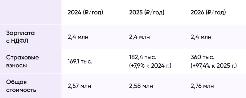 - С 2026 года: страховые взносы составят 15 % с выплат в пределах базы (2 979 000 ₽ в год) и 7,6 % с выплат сверх этой суммы.