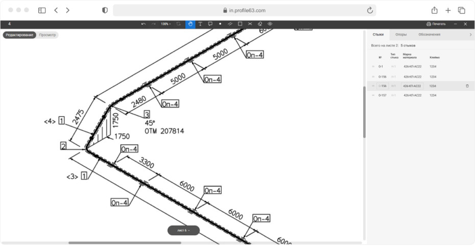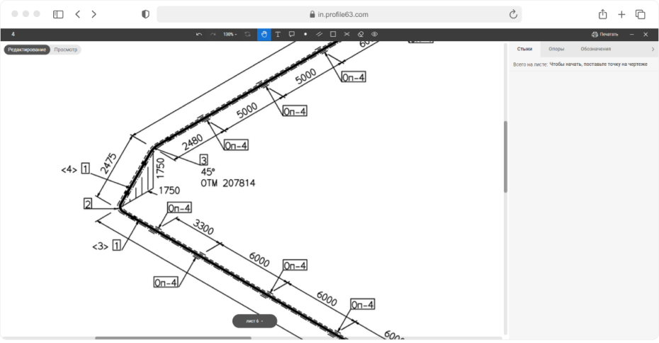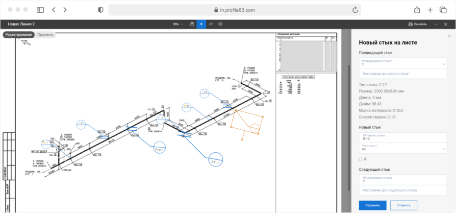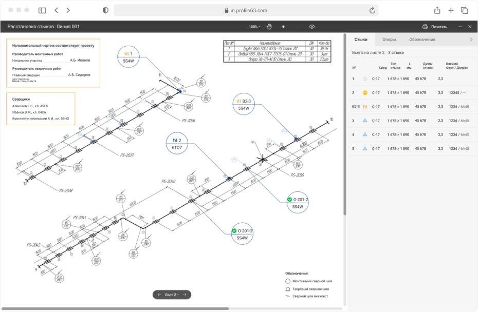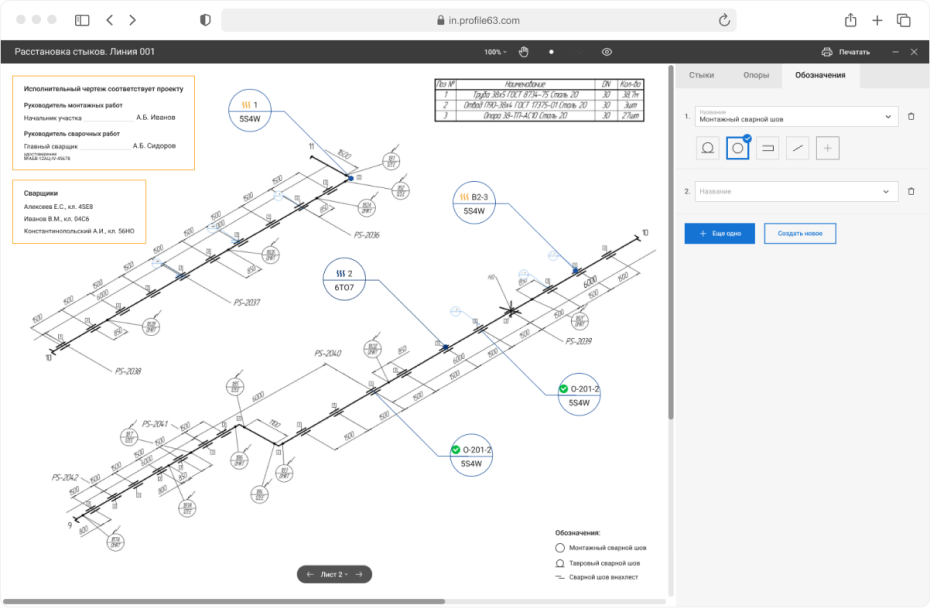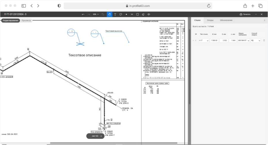 Схемы трубопроводов приходят в Профиль pdf-документом, который нужно преобразовать в удобный для редактирования формат. При загрузке чертежа в ЦУП сервер конвертирует в png и сохраняет в базу данных каждые 5 страниц. Обработка группами сокращает подготовку png до 10 минут. Один проект может состоять из 1000 листов и постраничный парсинг растягивал бы конвертацию на час. Редактор выдает png в 4К. Хорошего качества мы добились увеличением dpi и разрешения, которое сейчас более 1080 рх. В перспективе думаем перейти на svg, что сделает качество изображения еще лучше. Из листов сотрудник ПТО собирает линии и приступает к расстановке объектов. В процессе работы листы можно добавлять и удалять. Пользователь работает с чертежами через окно браузера в специальном визуальном редакторе, который находится непосредственно в ЦУПе. Работа происходит . Главным требованием к работе с изометрией трубопроводов, помимо расстановки стыков и опор, была возможность заполнять по ним информацию и передавать ее дальше в систему. Визуальный редактор состоит из двух частей: На холсте пользователь расставляет объекты для сварки с помощью разных инструментов: Их можно увеличивать, изменять градус поворота, переносить. Когда пользователь совершает действие, информация налету отправляется на сервер. При этом сам редактор работает плавно, обновление данных не грузит интерфейс. Чтобы добиться такого результата, мы уменьшили количество событий. По идее движение объекта запускает: создание данных, получение данных, выставление их на рабочую область, смену положения, изменение данных. Редактор же запускает событие только по измененной информации. Например, пользователь подвинул объект — обновились данные о положении. Визуальная часть редактора работает на Canvas в связке с Fabric.js. Fabric позволяет создавать объекты из нескольких элементов. Например, для опоры используются линии и круг. Кроме добавления объектов чертеж нужно привести в удобную для сварщика рабочую схему — убрать таблицы с материалами, обозначения на линии, дополнить комментарии к трубопроводу. Для этого реализован ластик, вставка белой области, возможность комментирования, создания выносок, отмена действий, переключение между состояниями. Выполнение всех операций на холсте доступно через горячие клавиши. Информационная боковая панель предназначена для ввода параметров объектов: тип, диаметр, длина, материал, его марка. Данные, которыми обогащается схема, параллельно обновляются в других интерфейсах системы. Здесь же автоматически формируются номера стыков и опор. Они являются сквозными по всей линии — на следующем листе текущий линии нумерация продолжится. При перетаскивании, добавлении, удалении элементов нумерация автоматически пересчитывается. Это единственная часть проекта, где мы используем триггеры в базе данных, которые вызываются при создании, перемещении объектов. По мере производственной работы на проекте в информационном меню появляется и обновляется статус объекта. Если сварщик вынужденно отошел от данных чертежа, сотрудник ПТО может скорректировать расхождение на схеме. Например, стереть ластиком расстояние 400 мм и прописывает новое 405 мм.. Несовпадения трассировки подсвечиваются в таблице. Когда все работы по проекту выполнены, трубопровод готов, сотрудник ПТО формирует схемы