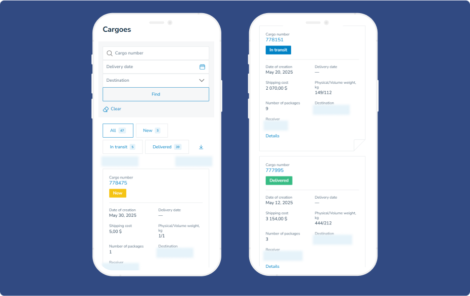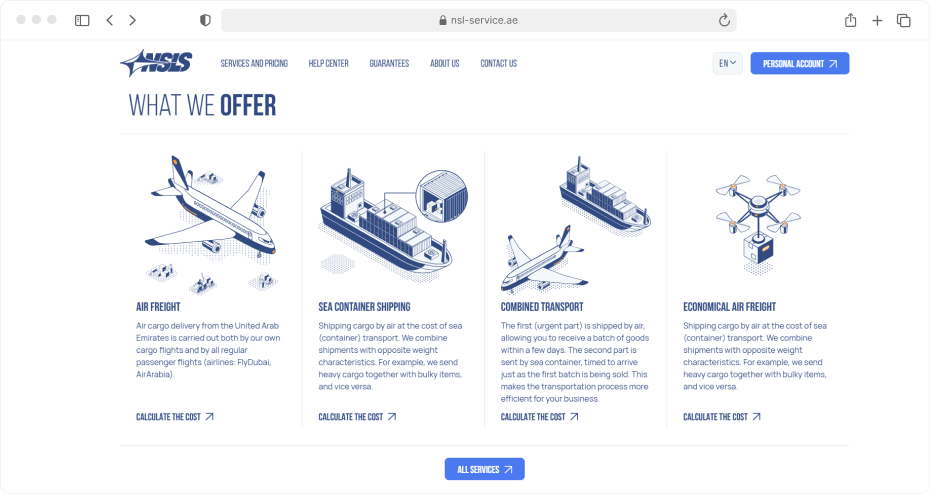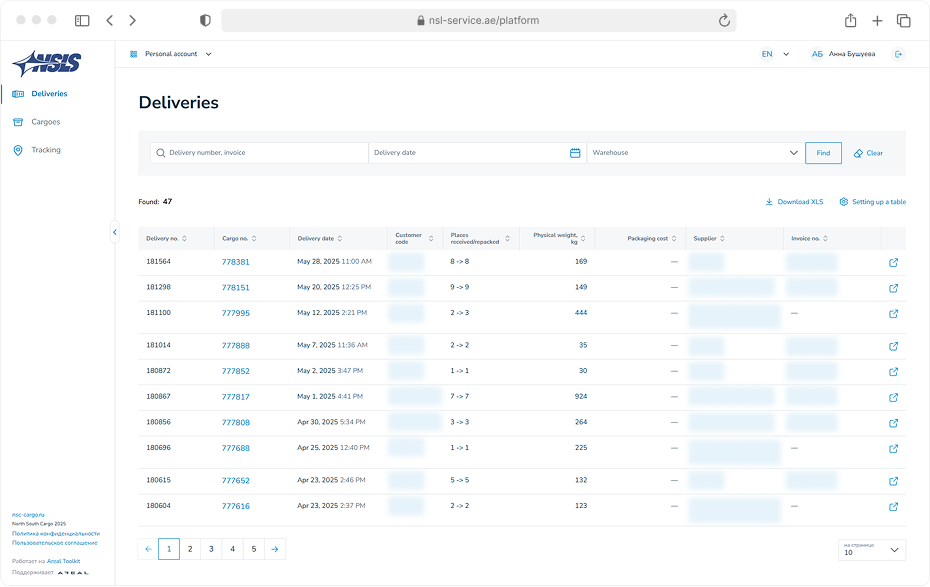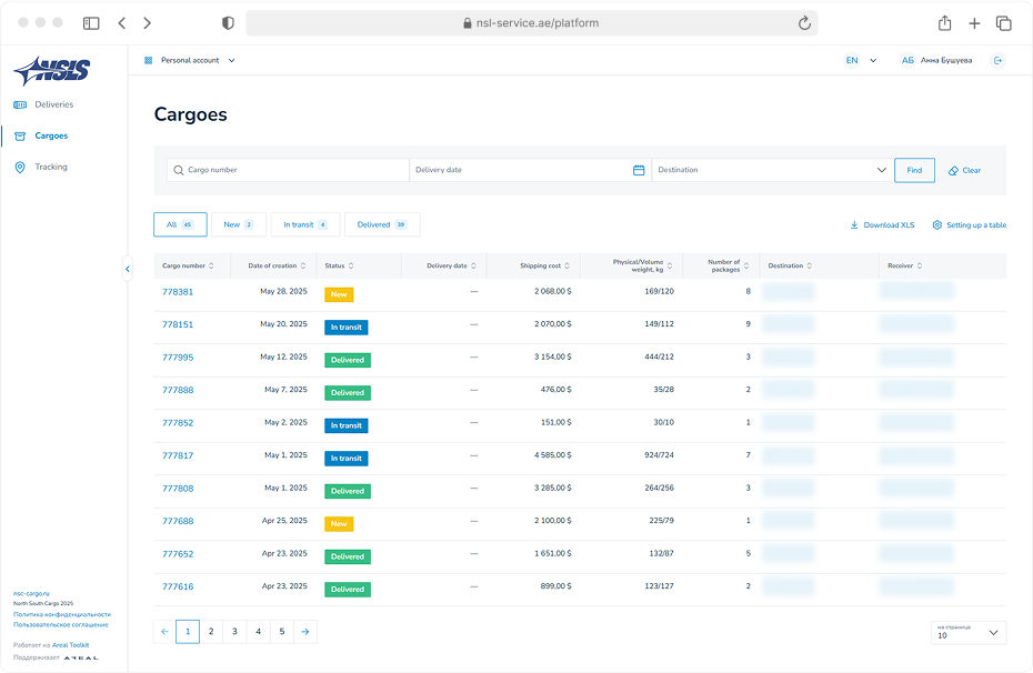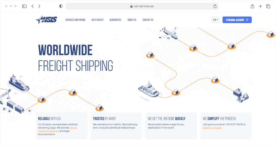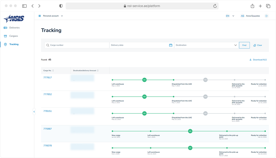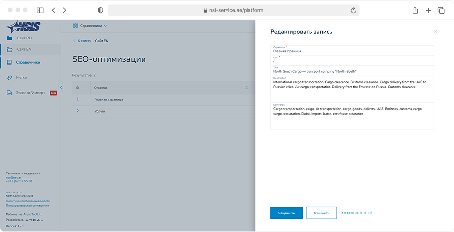 На главной странице — преимущества и ценности в работе, услуги, новости и расписание. Расписание отправок из ОАЭ помогает основным клиентам NSLS, физическим лицам, планировать перевозки с учетом будущих рейсов. Администраторы вносят новый рейс, указывая даты отправления и получения, а система самостоятельно по формулам рассчитывается определенный статус. Смена статусов и скрытие рейса с сайта также происходит автоматически. Сайт информационный, поэтому мы структурировали тексты: Сайт реализован на платформе Wapps, приложение Справочники. Платформа поддерживает мультиязычность, что позволило быстро запустить английскую и русскую версии сайта. Менеджер сайта внутри одной системы вносит или редактирует информацию на двух языках. Wapps дает возможность комфортно и оперативно поддерживать сайт в актуальном состоянии. Контент-менеджер без привлечения разработчиков редактирует тексты, таблицы, иллюстрации, заголовки, подзаголовки на страницах: Также администратор сайта полностью управляет SEO параметрами — настраивает для каждой страницы уникальный набор мета-тегов. Если для страницы не заданы теги, они подтягиваются с главной страницы. Это исключает нечитаемые названия страниц. Личный кабинет дает клиентам NSLS прямой доступ к информации о заказах: Для удобной работы с большими данными каждую таблицу сопровождает фильтр, а внутри столбцов сделана сортировка, также таблицы можно скачать в excel файл. Личный кабинет интегрирован с внутренней системой NSLS. Мы не храним на своей стороне закешированные данные, а наоборот при каждом пользовательском действии отправляем запрос в систему. Таким образом информация о перевозках всегда актуальна. Личный кабинет также разработан на платформе Wapps, приложение Справочники. Кроме того сайт и личный кабинет реализованы на одной площадке. То есть менеджеры, администраторы управляют сайтом и личным кабинетом из одной панели, без переключения между системами. Разработка личного кабинета и сайта на одной платформе позволила запустить системы одновременно. Пользователь, знакомится с NSLS через удобный и современный сайт. Став клиентом он начинает работать в личном кабинете, где всегда доступна актуальная информация о перевозках. Редизайн сайта и внедрение личного кабинета North South Logistics Services упростили коммуникацию с пользователями и оптимизировали процессы внутри команды.