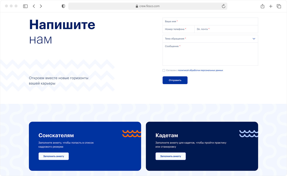 Путь моряка начинается на сайте crew.fesco.com. Это точка входа для кадрового резерва. Мы сделали его простым и четким — собрали всё, что важно соискателю. На сайте понятно, чем живёт FESCO, какие события происходят в компании, какие вакансии открыты и почему здесь хотят работать. Контентом управляет команда FESCO — без разработчиков.