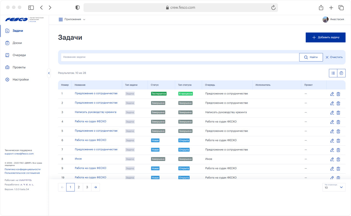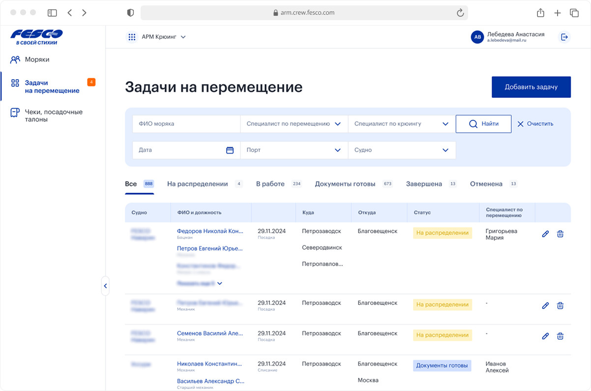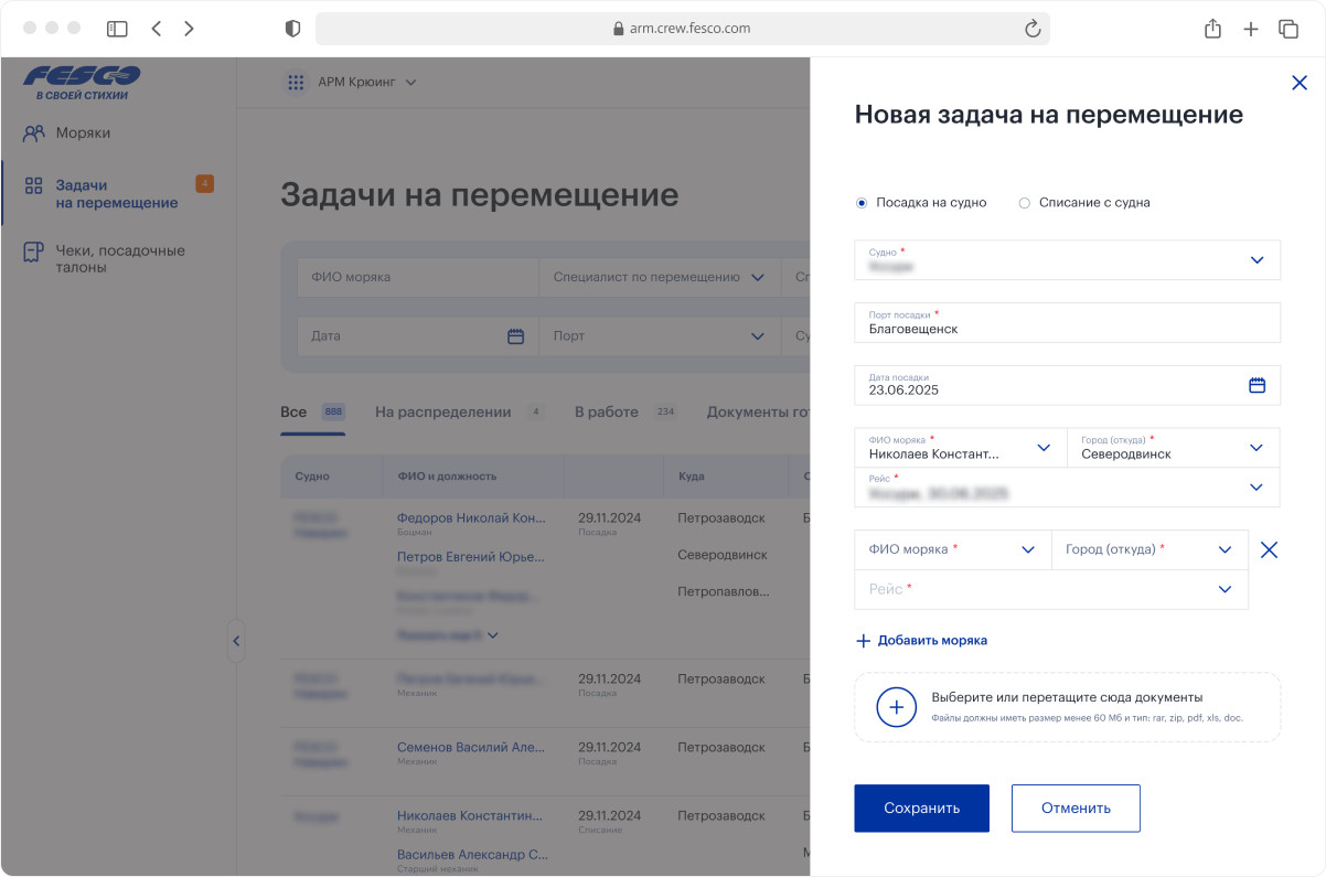 Если у соискателя есть вопрос, он оставляет обращение. Оно уходит в АРМ менеджерам в виде тикета: с типом, статусом, историей переписки. Запрос обрабатываются онлайн в АРМ. Сайт сразу включает соискателя в процесс работы в FESCO, предлагая заполнить анкету. Пользователь в личном кабинете поэтапно заполняет анкету: личный данные, пожелания по работе, навыки, опыт, загружает документы, сертификаты, характеристики. Параллельно есть возможность задать вопрос крюинг-менеджеру, подписаться на новостную рассылку. Анкету можно отредактировать, скачать, вернуться позже и подать снова, если пришел отказ. Система не ставит точку, а становится персональным пространством моряка для общения с FESCO. Для HR заполнение онлайн-анкеты означает другой уровень порядка: не папка с файлами и переписка, а живая база моряков с заметками, статусами и полной историей взаимодействия в удобном АРМ. Если кандидат перспективный, его переводят в резерв, если что-то нужно уточнить — менеджер делает это прямо в системе. На значимые действия соискателя и менеджера настроены уведомления. Когда моряк прошел отбор, начинается подготовка к рейсу внутри АРМ — насыщенная работа крюинг-менеджера, специалистов по перемещению экипажей, обучению. Площадка становится центром управления всеми моряками. В АРМ специалист видит каждого моряка: контакты, историю рейсов, статусы, документы с датами истечения, служебные отзывы из 1С. Информация собрана в гибкую таблицу с сортировкой и фильтрацией. На детальной странице моряка добавлено разделение по типам информации, чтобы не перегружать интерфейс: рейсы, задачи на обучение, проверка документов, документы, служебные отзывы. Если FESCO предлагает моряку новый рейс, менеджер получает уведомление о его решении. Менеджер формирует задачи специалистам по перемещению экипажей для организации доставки моряков в порт посадки, возвращения в город проживания. В задачу можно добавить как одного моряка, так и весь экипаж судна. По завершении рейса именно крюинг-менеджер изменяет статус задачи в системе. Специалист по перемещению сам выбирает, над каким рейсом будет работать. Менеджер отражается в таблице и на детальной странице задачи, чтобы два специалиста не начали работать над одним и тем же заданием. Основной рабочий инструмент специалиста по перемещению — загрузка разных типов файлов. Билеты, пропуски, ваучеры. Для этого создан удобный интерфейс, где задача на рейс разбита по морякам, а документы можно прикрепить разом, указывая тип. В процессе работы менеджер оставляет комментарии морякам, заметки себе, обновляет статусы. При изменении задачи извне, например, рейс переносится, специалист получает уведомление со ссылкой на историю изменений. Он сразу видит, какие правки были внесены. У моряка десятки документов и сертификатов. У всех разный срок действия. Раньше за актуальностью подготовки моряков следили вручную. АРМ перенесло в онлайн проверку документов и назначение обучения. При формировании задачи на рейс 1С сигнализирует АРМ, что у моряка недействителен или скоро будет просрочен сертификат. АРМ автоматически создает заявку и предлагает менеджеру решение: назначить обучение или нет. Если обучение нужно — менеджер выбирает учебное заведение, программу, выставляет срок, согласует с моряком, загружает направление, следит за