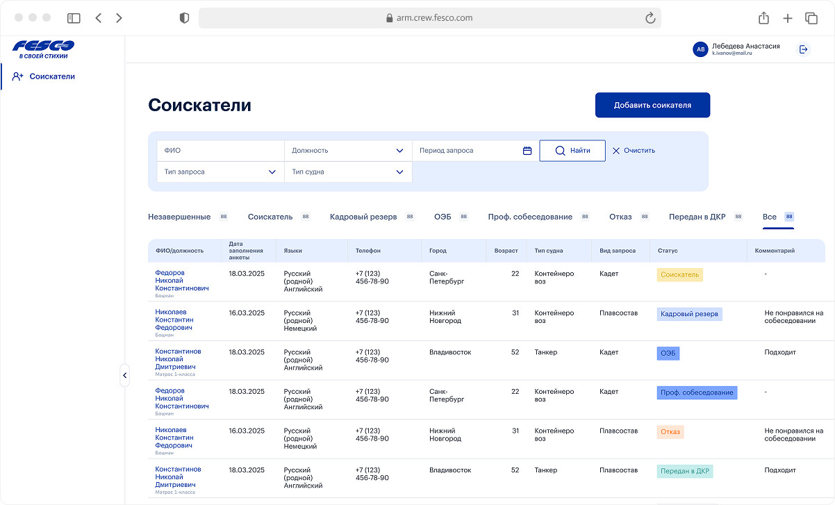 Личный кабинет и АРМ помогают FESCO формировать кадровый резерв и работать со студентами, выпускниками морских училищ — теми, кто только делает первые шаги в профессии.