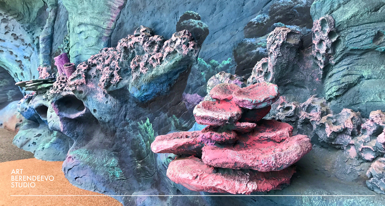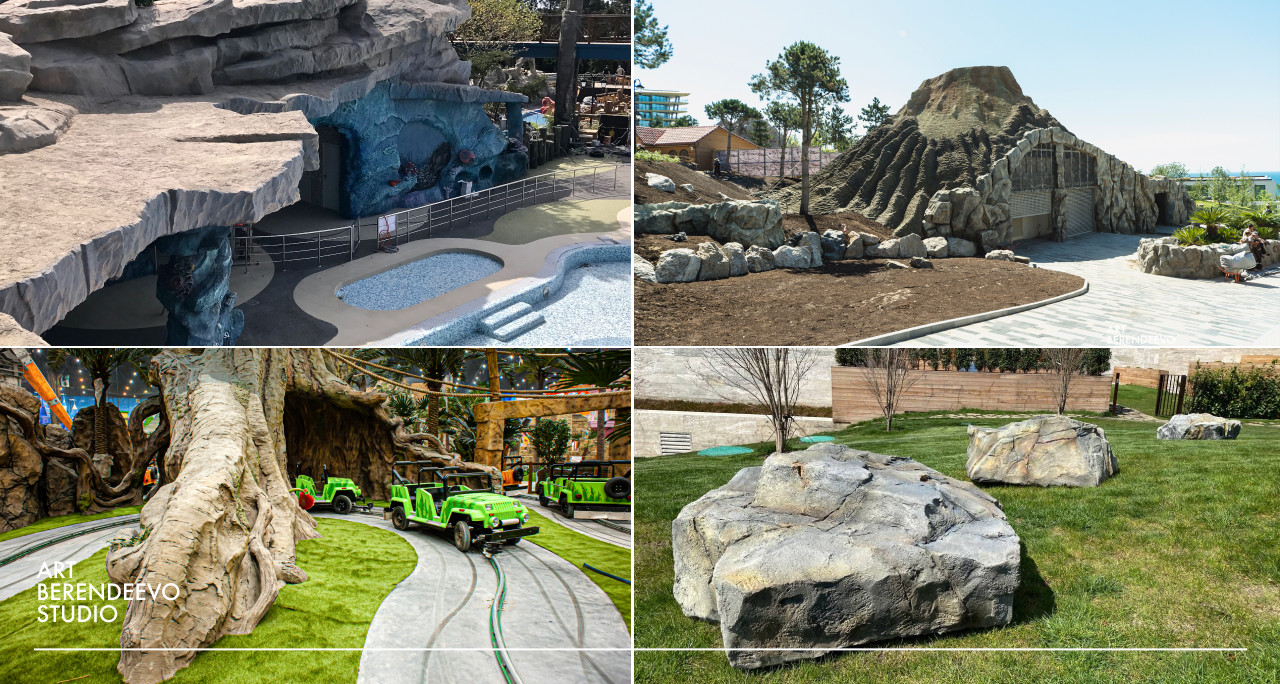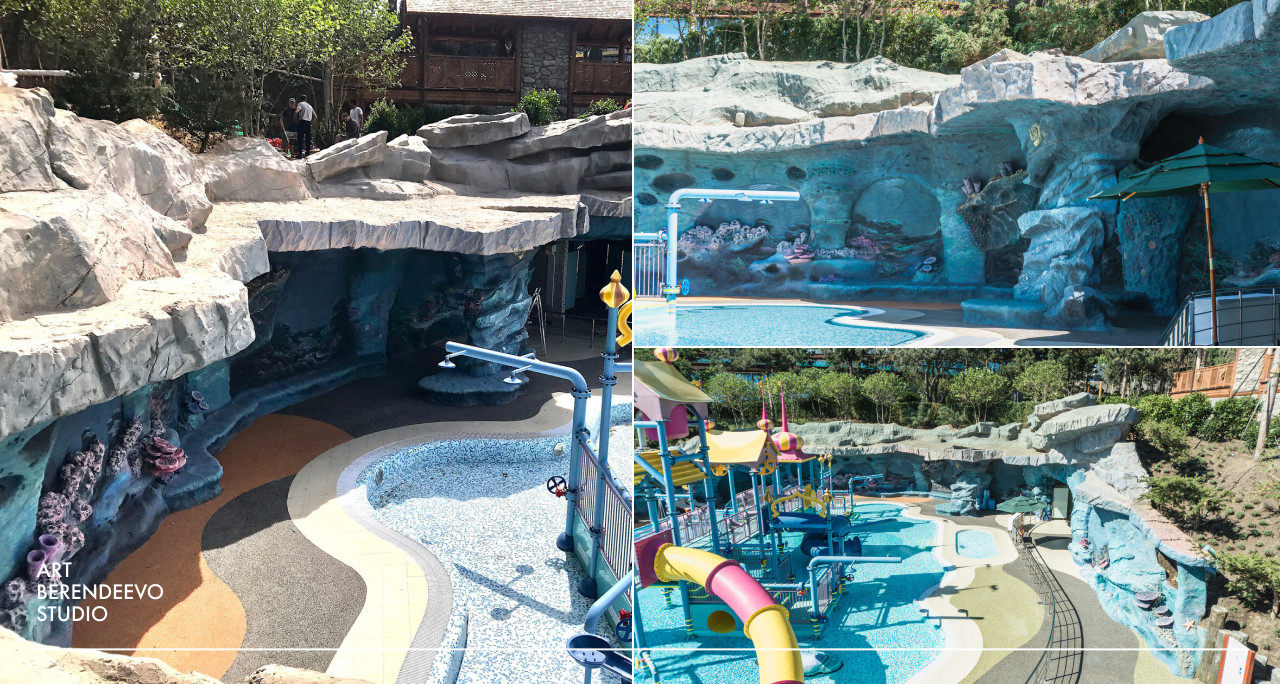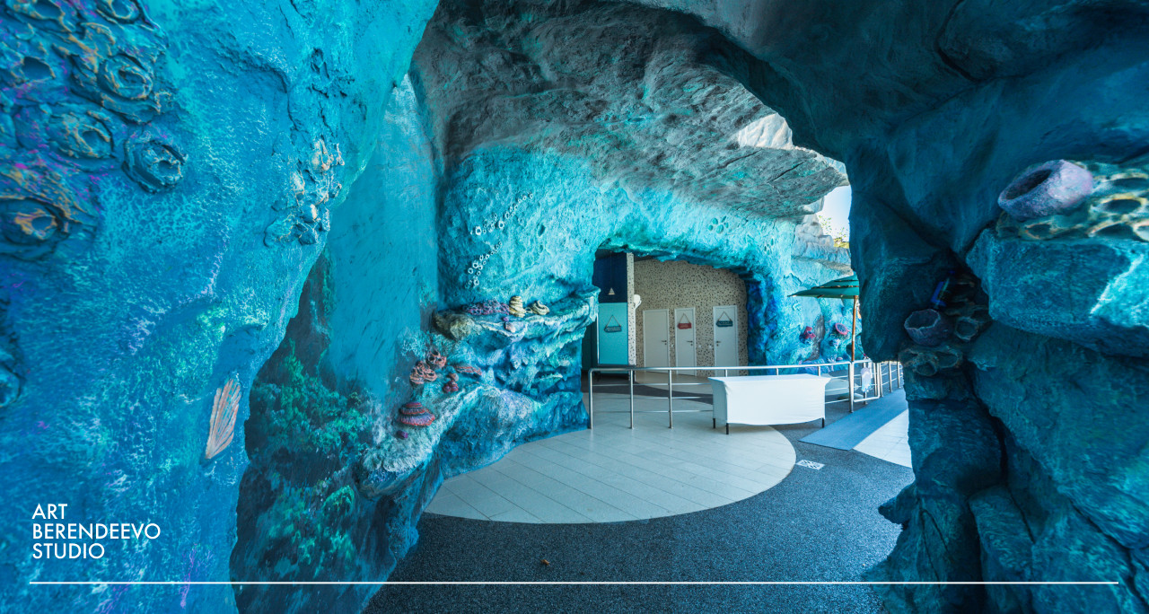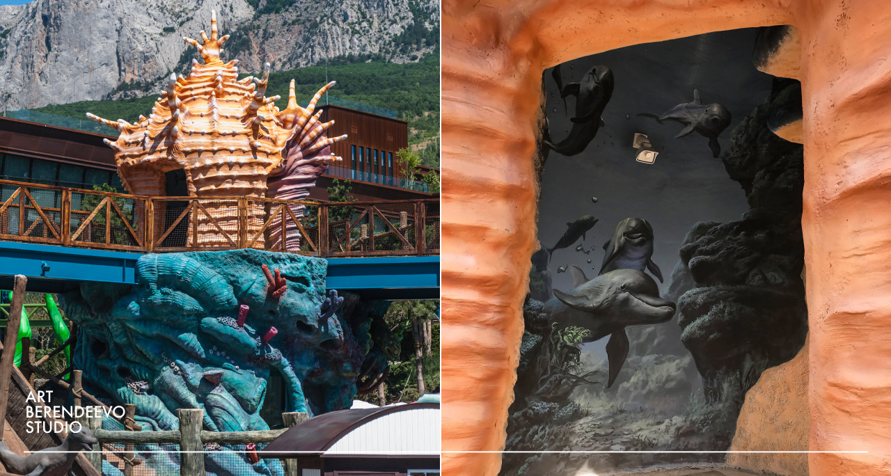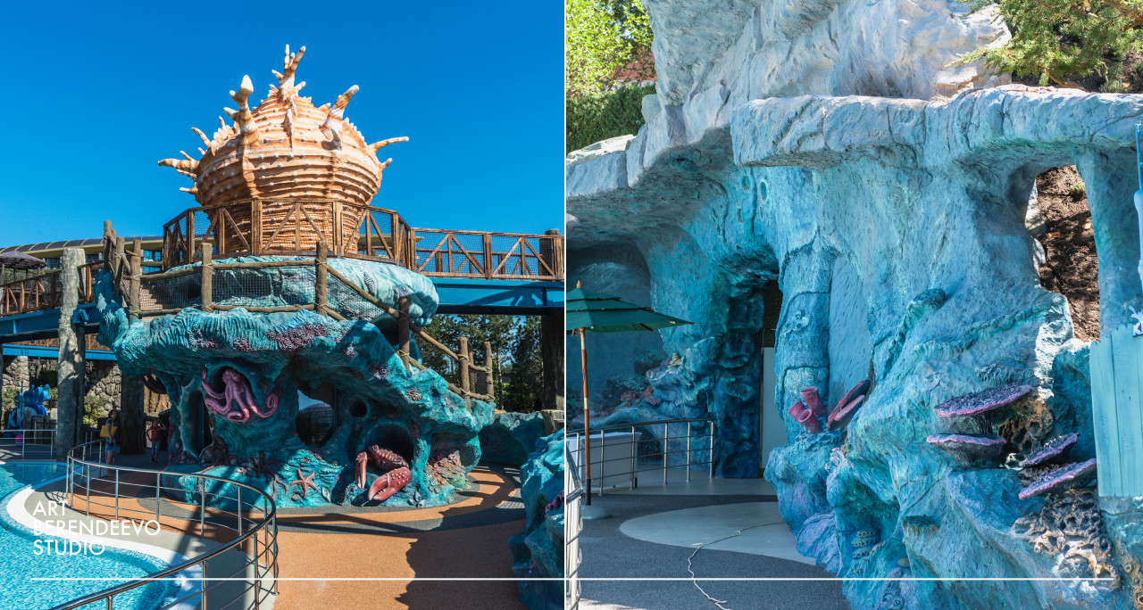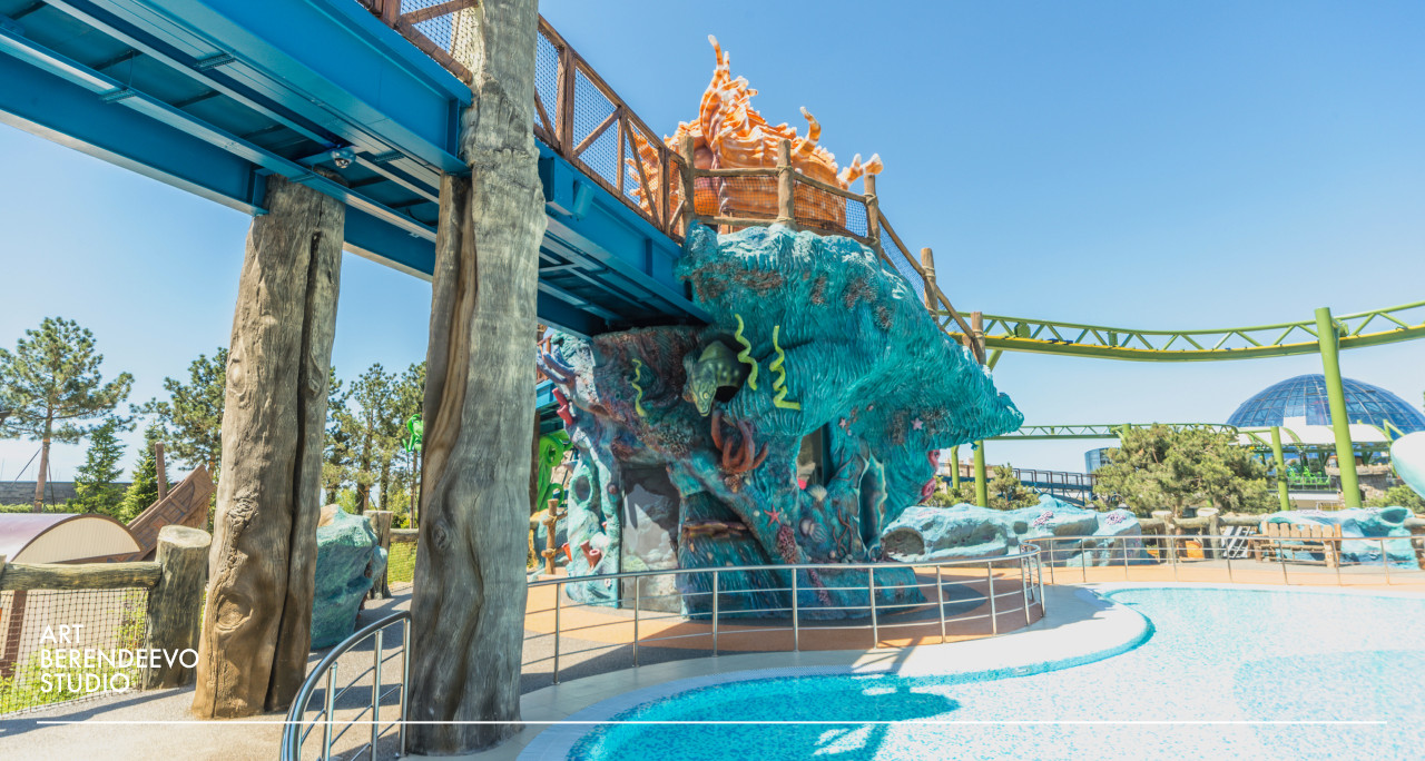 Экзотическая атмосфера в аквапарках достигается посредством искусственных водопадов, гротов, пальм и деревьев из арт-бетона. Яркий и стильный декор создает уютную обстановку для отдыха детей и взрослых. От того, насколько качественно и реалистично выполнены декорации аквапарка, напрямую зависит его посещаемость и прибыльность. Любой развлекательный комплекс подразумевает наличие неприглядных элементов ― технических сооружений, опор освещения, распределительных щитов и люков коммуникаций. Декоративно-облицовочные работы с использованием архитектурного бетона позволяют их органично замаскировать и скрыть от глаз гостей. Максимально реалистичная имитация природных форм поддерживает общую дизайн-концепцию помещения и дает широкие возможности для создания креативных объектов: Ключевым фактором выбора декораций для общественных пространств является надежность материала, из которого они изготовлены. Современный рынок отделочных материалов предоставляет огромное разнообразие: от 3D-стен из гипса и лепных изделий из полиуретана до фитостен из живых или искусственных растений. Однако, самым оптимальным вариантом считается архитектурный бетон.Благодаря особой технологии производства, арт бетон приобретает ряд выгодных преимуществ в отношении других материалов. Пластичность смеси и использование широкой палитры цветов позволяет придавать изделиям из архитектурного бетона любую конфигурацию, цвет и рельефность. С его помощью можно сымитировать природный рельеф любых камней и скал, детальный рисунок коры деревьев, естественную форму и оттенок кораллов и морских раковин. Арт бетон не поддерживает горения и не способствует распространению возгорания с других объектов, что критически важно для обеспечения безопасности посетителей и персонала. Проведенные пожарные испытания показали, что облицовочные конструкции, выполненные ART BERENDEEVO STUDIO, относятся к классу горючести — Г1 (негорючие). Технология производства смеси подразумевает использование экологически безопасных материалов, исключая токсичность элементов декора даже при нагревании. Продукция ART BERENDEEVO проходила санитарно-эпидемиологические испытания. Результаты экспертизы подтвердили соответствие продукции требованиям и нормативным нормам РФ. В составе готовой смеси архитектурного бетона не остается ни воды, ни воздуха, ни синтетических полимеров, поэтому готовые изделия защищены от деформации и хрупкости при перепадах температур или от воздействия солнечных лучей. Специальная обработка декораций из арт бетона также обеспечивает им высокую гидрофобность, что играет важную роль в оформлении пространств с водными сооружениями. Одним из последних проектов ART BERENDEEVO STUDIO по благоустройству аквапарков и океанариумов стал парк развлечений «Dreamwood», расположенный на территории гостиничного комплекса Mriya Resort&Spa 5* в Ялте. Комплекс работ по преображению парка включал в себя: Облагороженный командой студии ART BERENDEEVO парк развлечений «Dreamwood» открылся в августе 2018 года, и за короткий срок завоевал любовь не только местных жителей, но и гостей близлежащих курортных городов. Тенденция использования арт бетона для декорирования аквапарков и океанариумов стремительно набирает популярность по всему миру, благодаря множеству выгодных свойств материала и эффект
