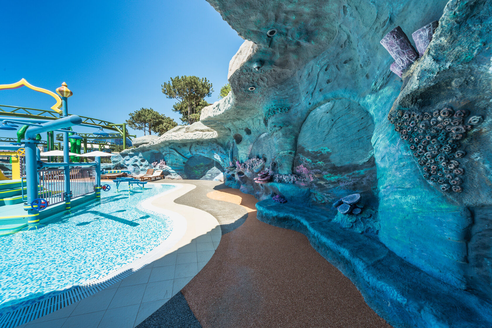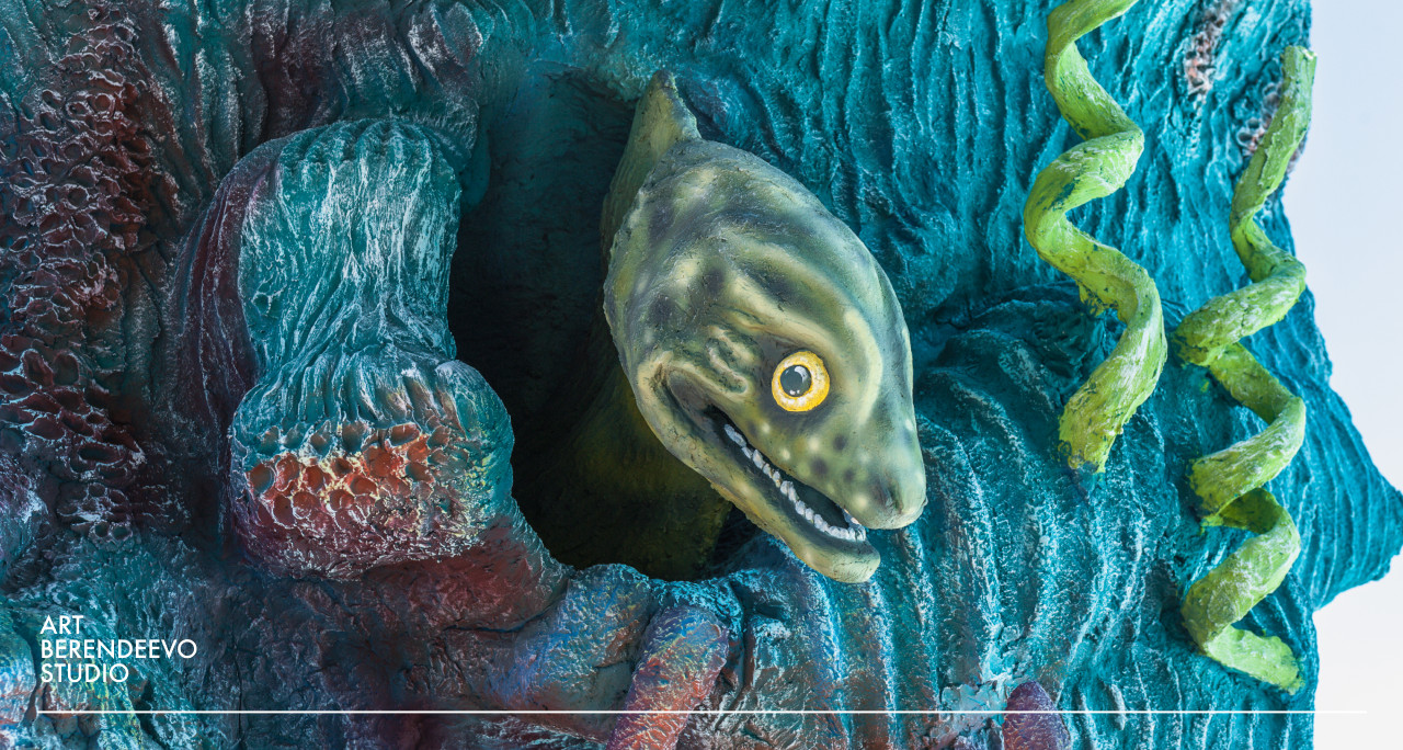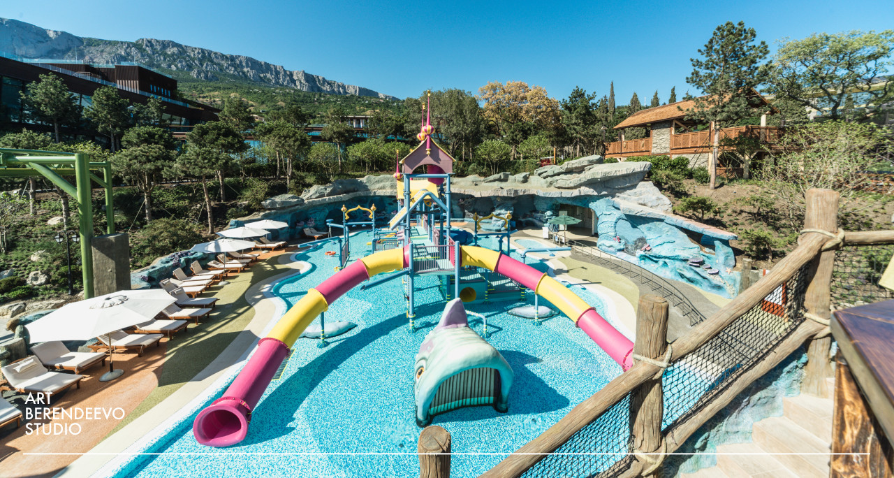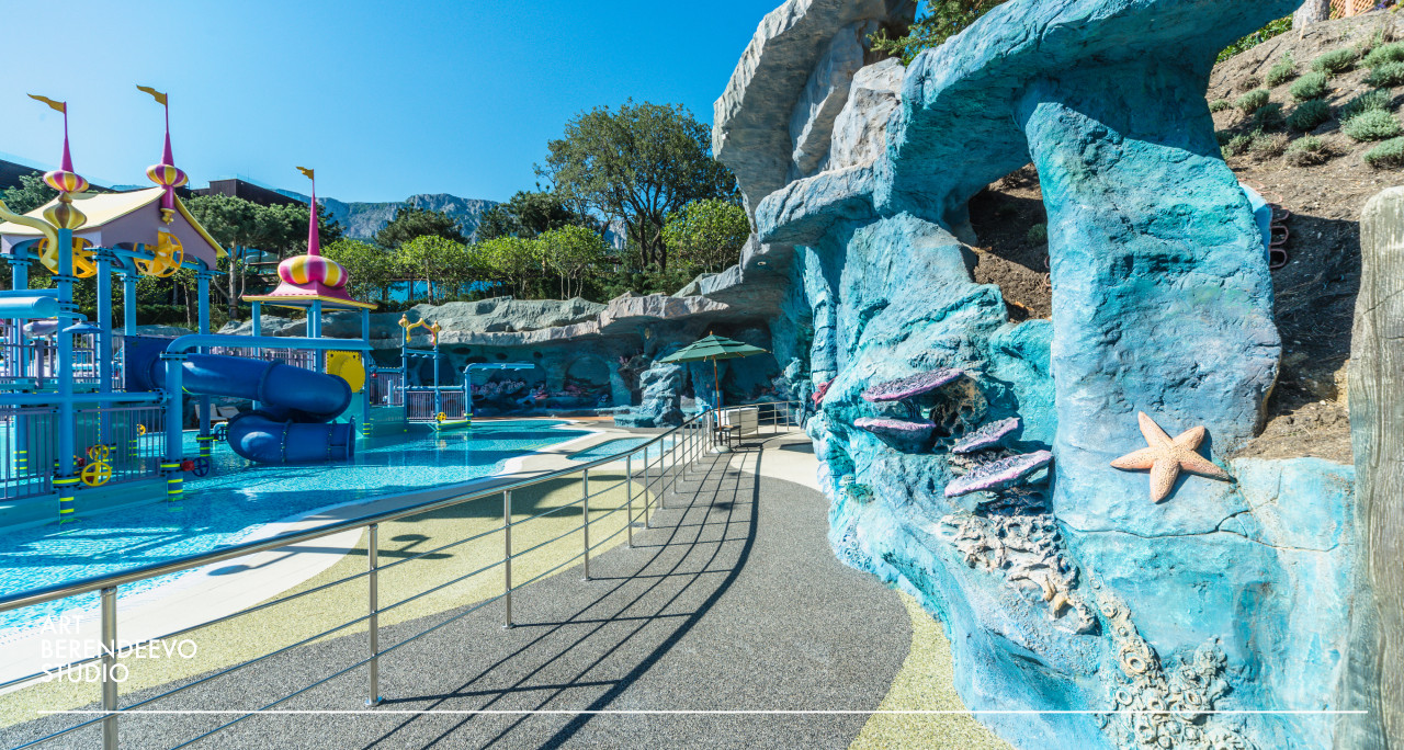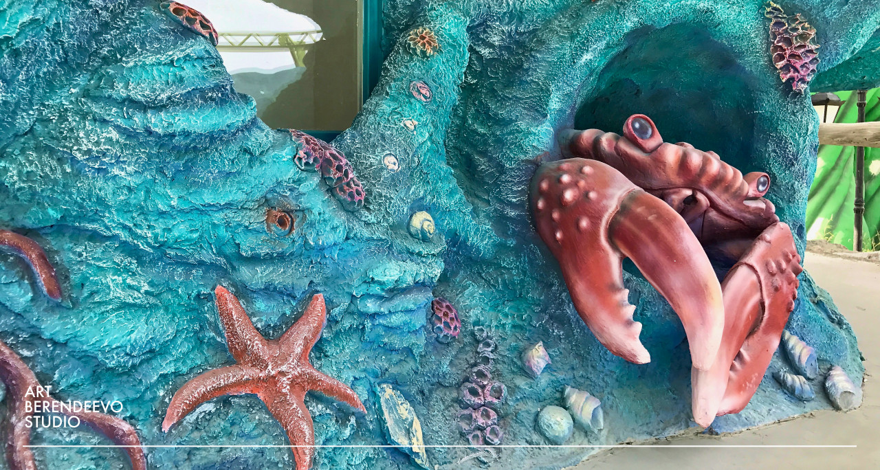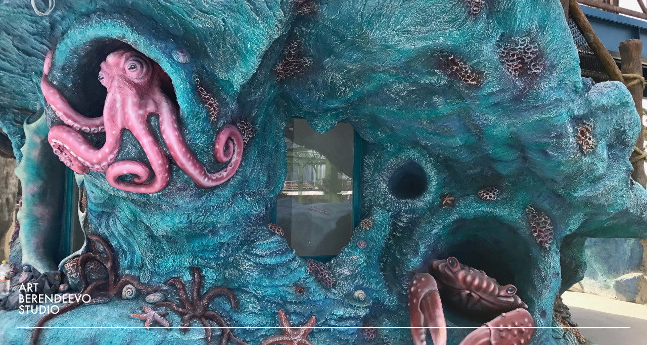 Экзотическая атмосфера в аквапарках достигается посредством искусственных водопадов, гротов, пальм и деревьев из арт-бетона. Яркий и стильный декор создает уютную обстановку для отдыха детей и взрослых. От того, насколько качественно и реалистично выполнены декорации аквапарка, напрямую зависит его посещаемость и прибыльность. Любой развлекательный комплекс подразумевает наличие неприглядных элементов ― технических сооружений, опор освещения, распределительных щитов и люков коммуникаций. Декоративно-облицовочные работы с использованием архитектурного бетона позволяют их органично замаскировать и скрыть от глаз гостей. Максимально реалистичная имитация природных форм поддерживает общую дизайн-концепцию помещения и дает широкие возможности для создания креативных объектов: Ключевым фактором выбора декораций для общественных пространств является надежность материала, из которого они изготовлены. Современный рынок отделочных материалов предоставляет огромное разнообразие: от 3D-стен из гипса и лепных изделий из полиуретана до фитостен из живых или искусственных растений. Однако, самым оптимальным вариантом считается архитектурный бетон.Благодаря особой технологии производства, арт бетон приобретает ряд выгодных преимуществ в отношении других материалов. Пластичность смеси и использование широкой палитры цветов позволяет придавать изделиям из архитектурного бетона любую конфигурацию, цвет и рельефность. С его помощью можно сымитировать природный рельеф любых камней и скал, детальный рисунок коры деревьев, естественную форму и оттенок кораллов и морских раковин. Арт бетон не поддерживает горения и не способствует распространению возгорания с других объектов, что критически важно для обеспечения безопасности посетителей и персонала. Проведенные пожарные испытания показали, что облицовочные конструкции, выполненные ART BERENDEEVO STUDIO, относятся к классу горючести — Г1 (негорючие). Технология производства смеси подразумевает использование экологически безопасных материалов, исключая токсичность элементов декора даже при нагревании. Продукция ART BERENDEEVO проходила санитарно-эпидемиологические испытания. Результаты экспертизы подтвердили соответствие продукции требованиям и нормативным нормам РФ. В составе готовой смеси архитектурного бетона не остается ни воды, ни воздуха, ни синтетических полимеров, поэтому готовые изделия защищены от деформации и хрупкости при перепадах температур или от воздействия солнечных лучей. Специальная обработка декораций из арт бетона также обеспечивает им высокую гидрофобность, что играет важную роль в оформлении пространств с водными сооружениями. Одним из последних проектов ART BERENDEEVO STUDIO по благоустройству аквапарков и океанариумов стал парк развлечений «Dreamwood», расположенный на территории гостиничного комплекса Mriya Resort&Spa 5* в Ялте. Комплекс работ по преображению парка включал в себя: Облагороженный командой студии ART BERENDEEVO парк развлечений «Dreamwood» открылся в августе 2018 года, и за короткий срок завоевал любовь не только местных жителей, но и гостей близлежащих курортных городов. Тенденция использования арт бетона для декорирования аквапарков и океанариумов стремительно набирает популярность по всему миру, благодаря множеству выгодных свойств материала и эффект