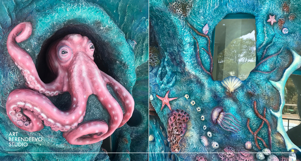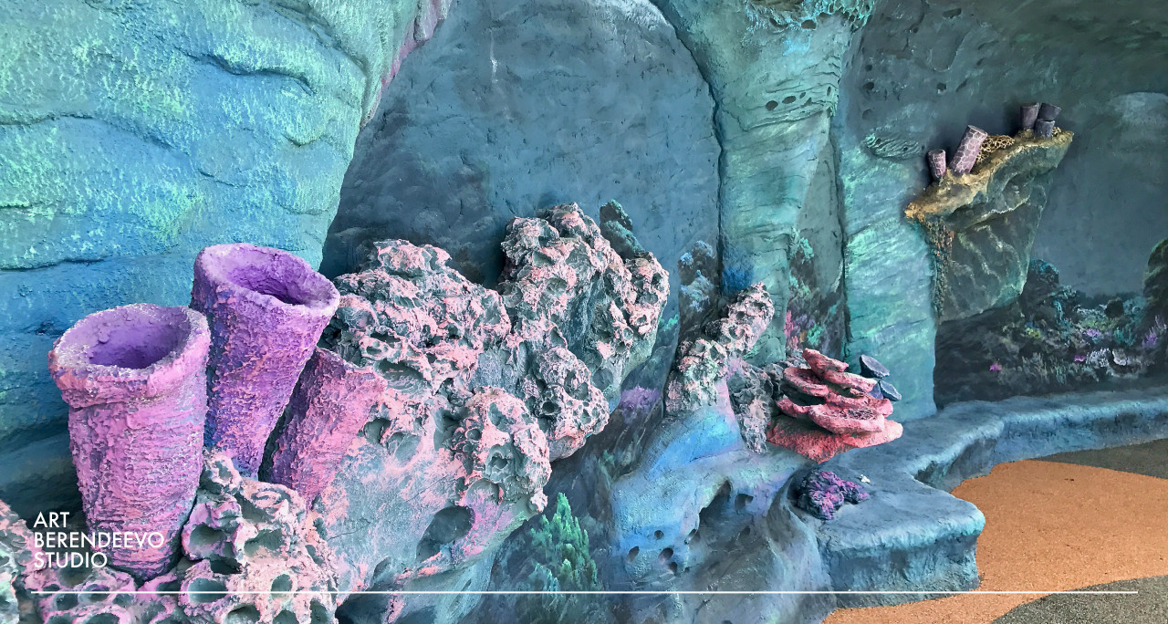 Декорирование бетоном интерьеров океанариума имитирует природную среду обитания водных жителей. Декорации в океанариуме могут включать в себя скалистые гроты, водопады, раковины, надводные и подводные камни. Такие элементы декора из арт-бетона создают аутентичную атмосферу и погружают посетителей океанариума в живописный подводный мир.