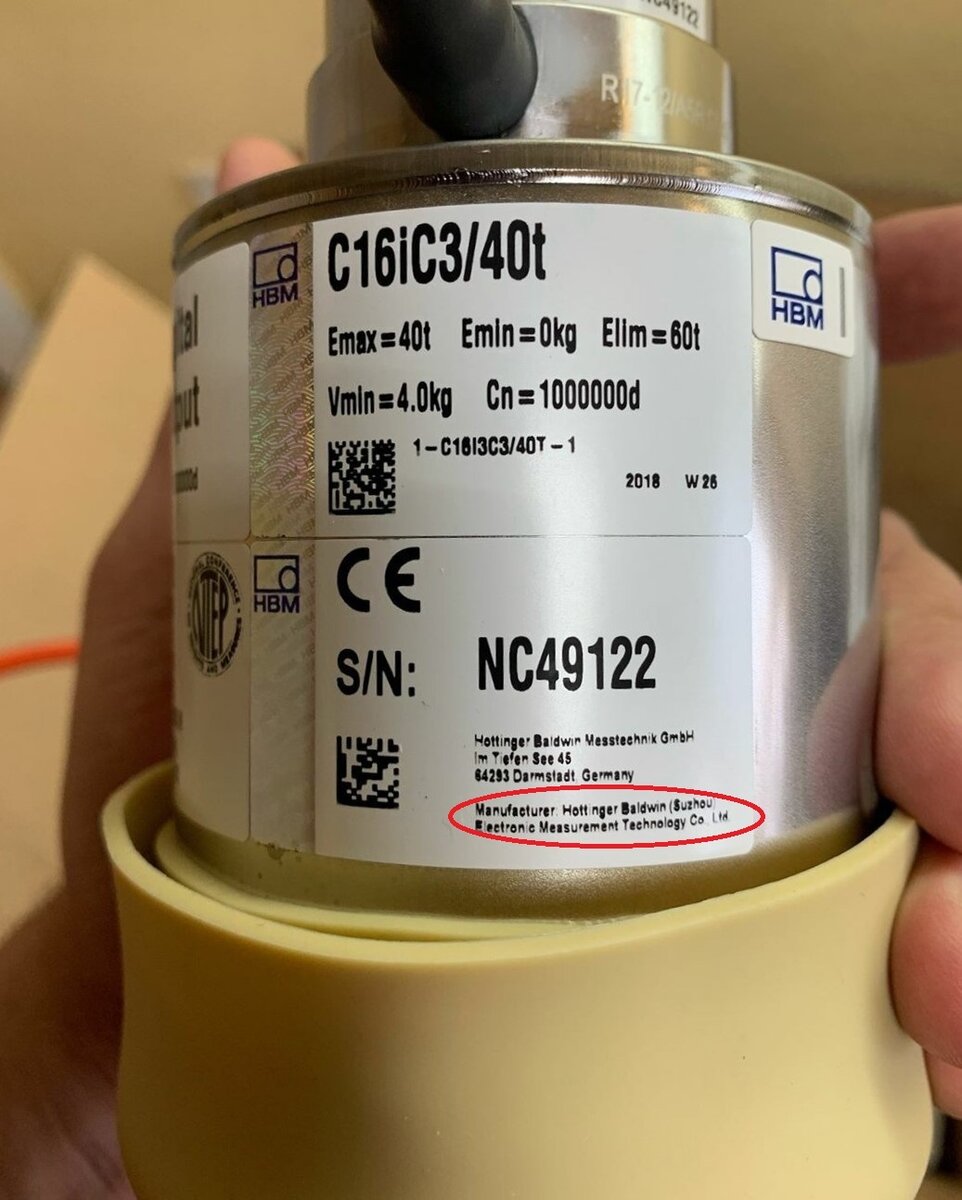 Самый востребованный тезодатчик типа С16iС3, которые массово используют в производстве автомобильных весов указано, что производителем этих датчиков является компания Hottinger Baldwin (Suzhou) Electronic Measurement Technology Co.,Ltd . Продукция этой компании маркируется надписью Сделано в Китае «Made in China».