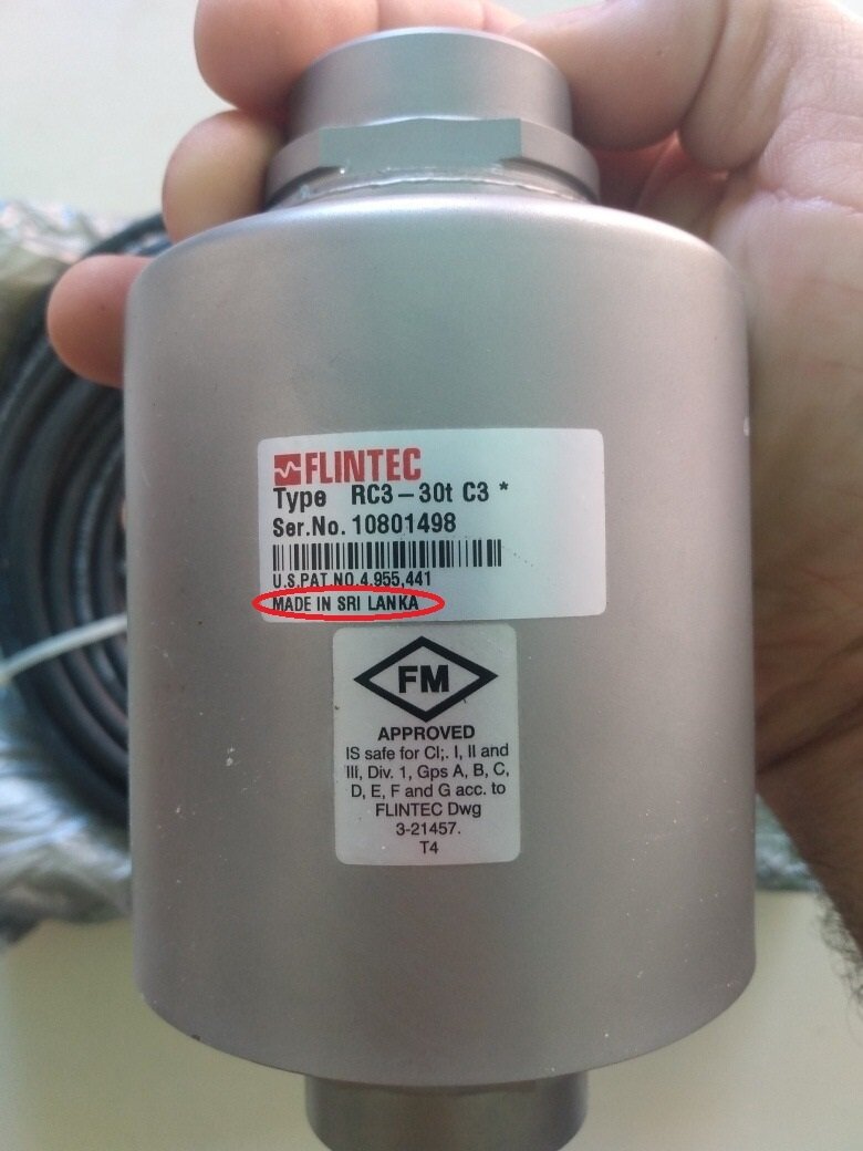 FLINTEC GmbH Производство датчиков в Шри-Ланке История компании Flintec начинается в 1968 году, когда два инженера основали компанию по разработке весов и тензометрического оборудования для них. С 1996 года продукция Flintec производится в Шри-Ланке. Шри-Ланка является родиной производства датчиков компании Flintec, где есть два современных предприятия. Первый в Катунаяке, недалеко от столицы Коломбо. Второй — в Коггале, который находится недалеко от Галле на юге острова. На предприятии в Катунаяке расположены установки механической обработки и термообработки. Оно специализируется на производстве общепромышленных датчиков. Предприятие в Коггале специализируется на производстве тензометрических датчиков и медицинских изделий. Оно также производит датчики в большом объеме для различных отраслей промышленности. Общая производственная площадь составляет 12 000 м2. На первом фото распространенный датчик типа RC3-30t немецкой фирмы Flintec Gmbh. Этот датчик широко используется для комплектации автомобильных весов. Надпись на шильдике «Made in Sri Lanka» (Сделано в Шри-Ланке). Производство тензодатчиков в Германии по полному циклу уже давно не существует. Потому гордая надпись «Сделано в Германии» не что иное, как маркетинговый ход. Для получения такой надписи производитель использует уловку в регламенте ЕС, в которой говориться, что страной-производителем товара считается то государство, в котором «была произведена экономически обоснованная его конечная обработка». Незнанием покупателя зачастую пользуются недобросовестные производители автомобильных весов, вводя его в заблуждение и гарантируя настоящее немецкое качество своего оборудования по весьма высокой цене. Перед тем как заключать договор поставки, стоит запросить документы на оборудование и живые фотографии тензодатчиков которые будут установлены при монтаже. Так же стоит перед монтажом внимательно осмотреть датчики, чтобы убедиться в подлинности заводского производства, ведь участились случае выдачи датчиков неизвестного происхождения за фирменные.