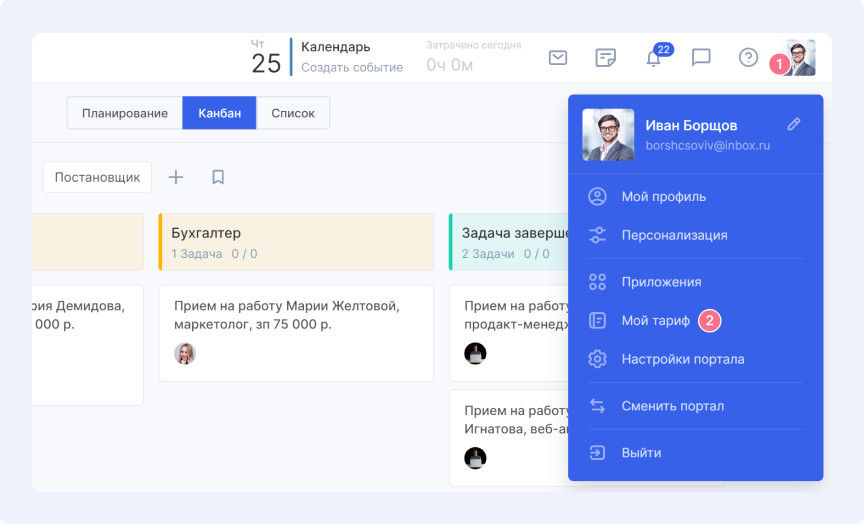 После регистрации и входа в систему нажмите на портрет в правом верхнем углу (1) и через меню перейдите на страницу «Мой тариф» (2). Нажмите «Ввести промокод». В появившемся окне введите промокод и активируйте его.