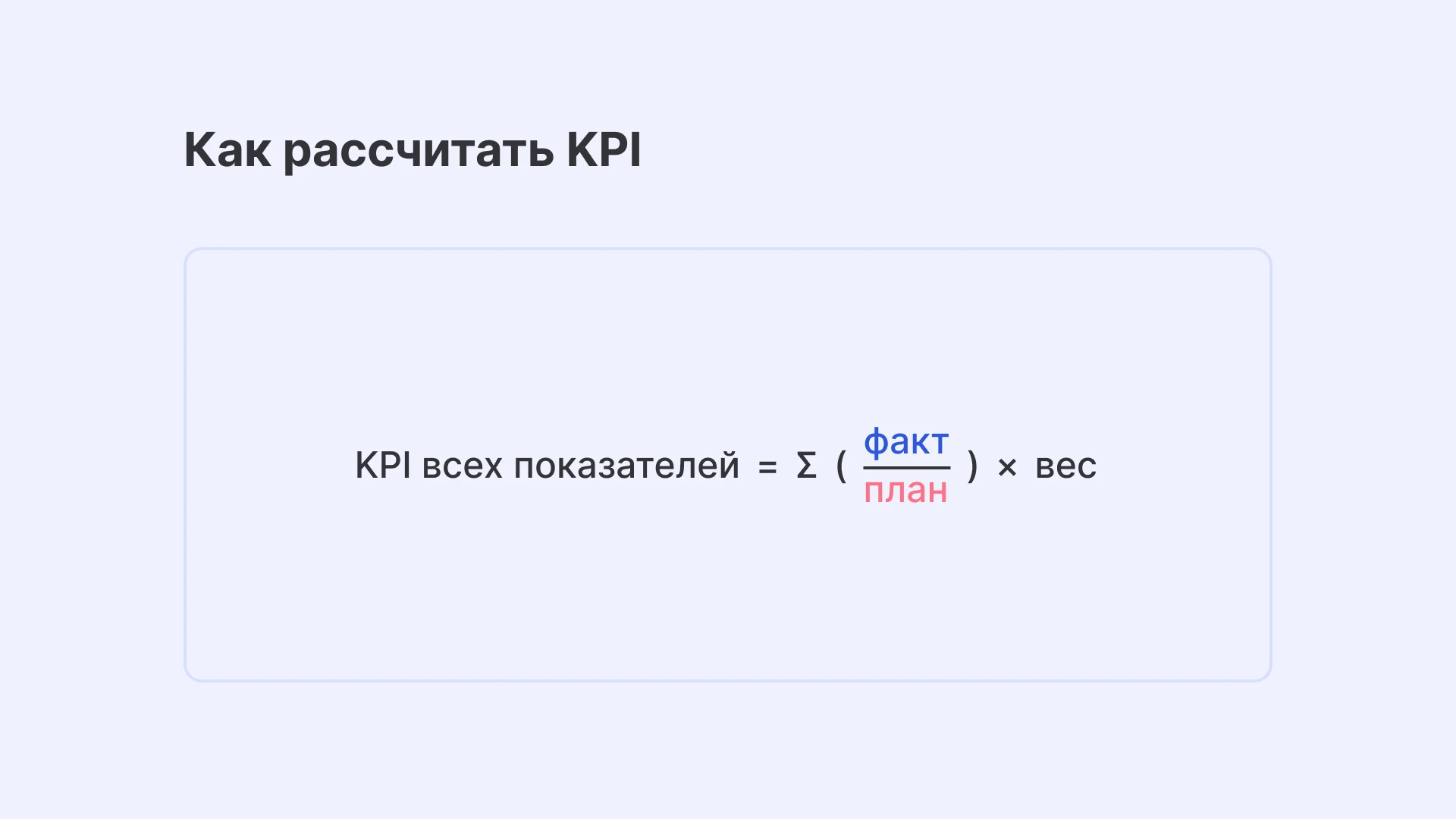 Итоговый показатель эффективности рассчитывается так: фактический результат делим на плановый и умножаем на вес показателя, коэффициент важности значения для должности. Он принимает значение от 0 до 1.