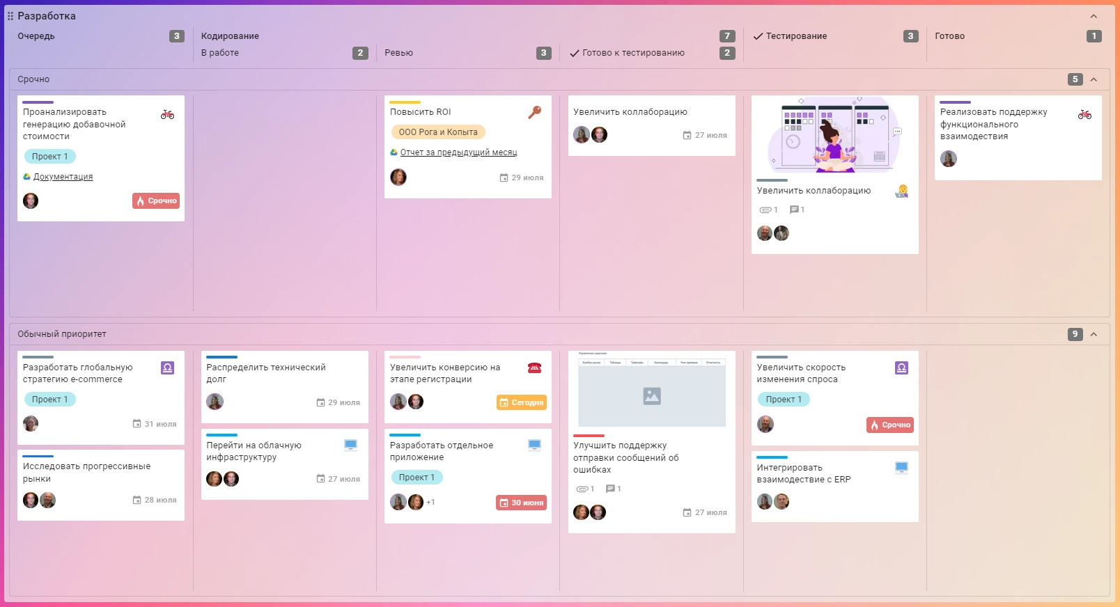 - Настраиваемая канбан-доска. Система позволяет выстроить процесс под себя. Вы можете создавать собственные колонки, подколонки и горизонтальные дорожки, чтобы визуализировать поток задач по стадиям. При этом доступна функция ограничения WIP — лимита задач в работе. Если карточка «застряла», система напомнит об этом.