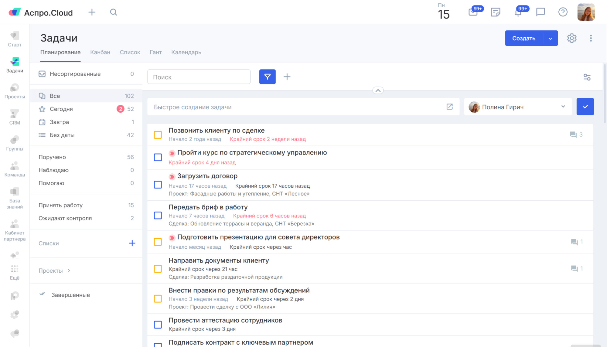 Аспро.Cloud — российская облачная платформа для комплексного управления бизнес-процессами. В одном сервисе сочетаются инструменты для планирования задач, управления проектами, продажами и даже финансовой аналитики.