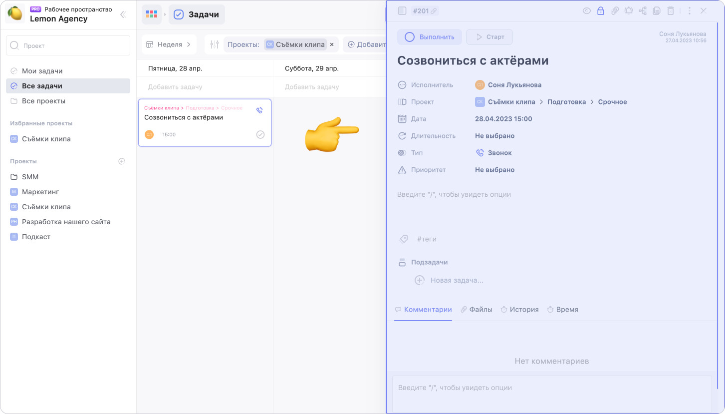 - Совместная работа. Все участники проекта получают уведомления о новых комментариях и изменениях в задачах. Это позволяет легко отслеживать прогресс и избегать недопонимания.