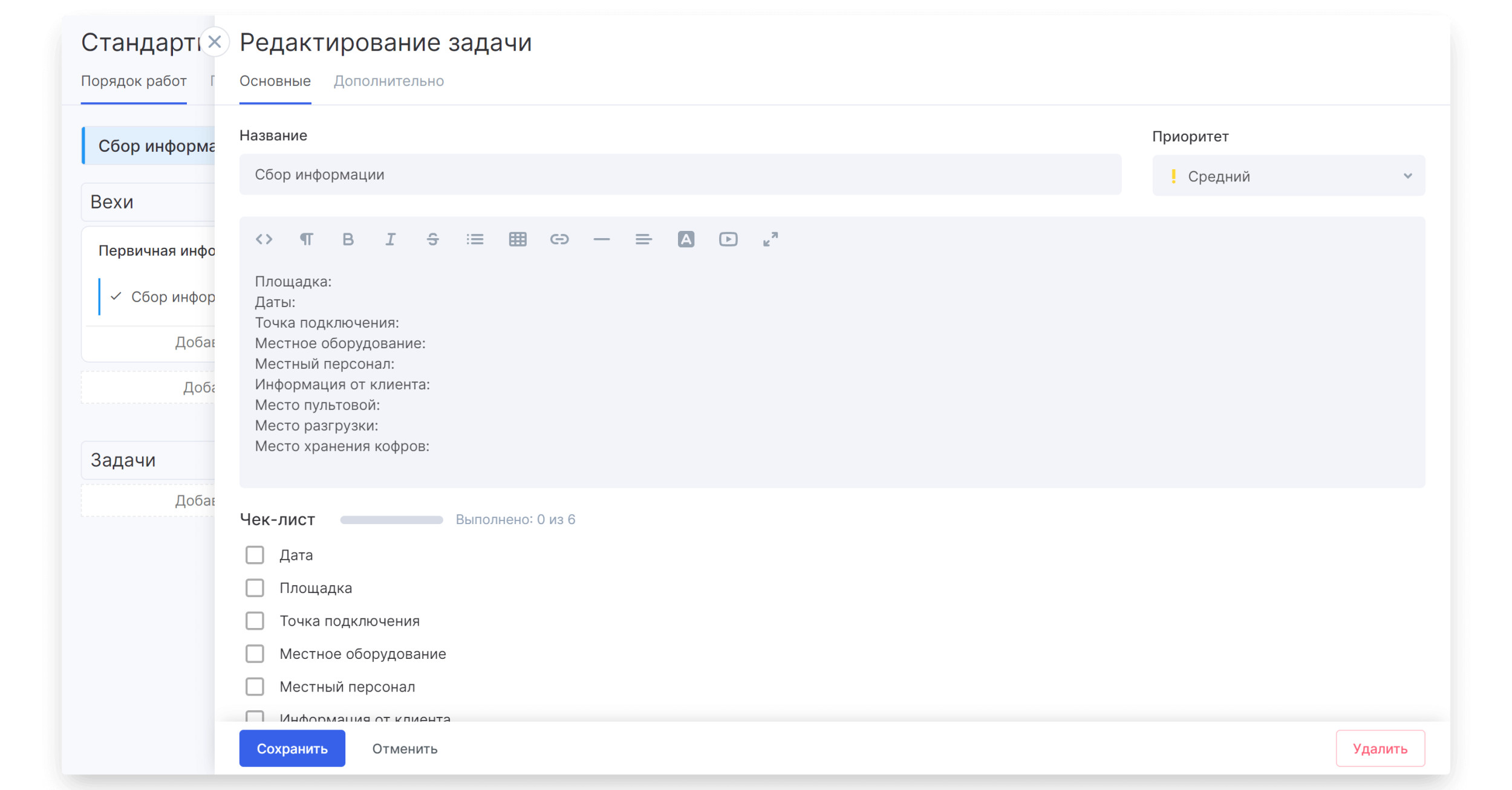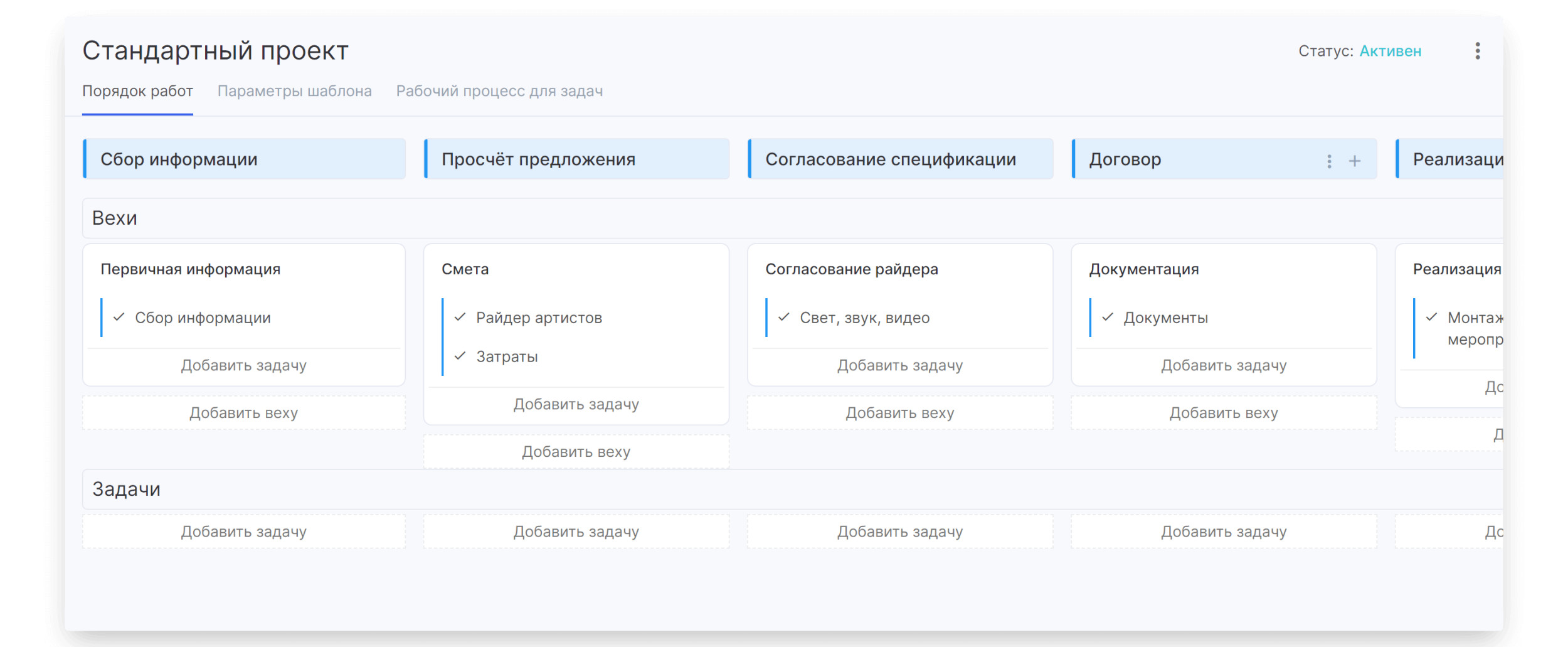 Продаж как таковых не осталось: клиенты сами обращаются за арендой. Поэтому все этапы — от согласования сметы до акта выполненных работ — теперь ведутся внутри проекта.