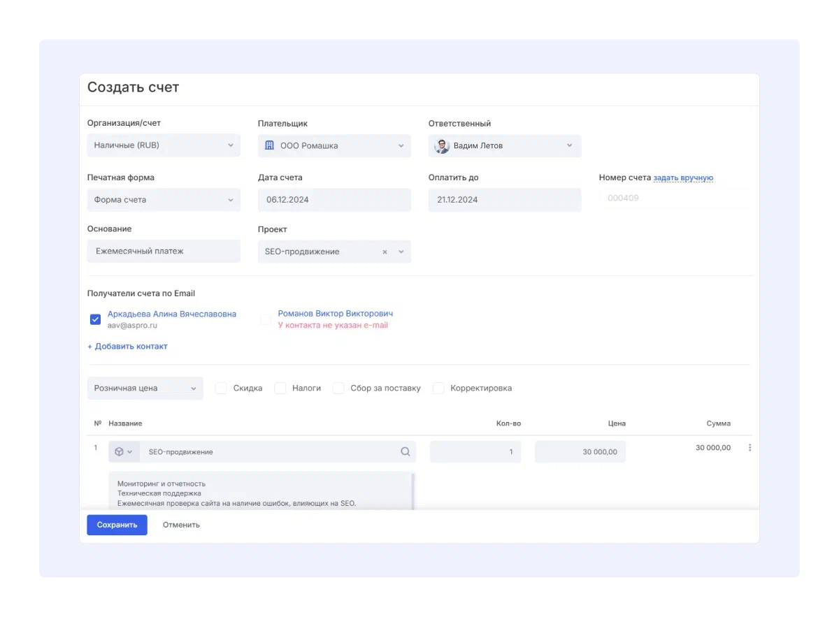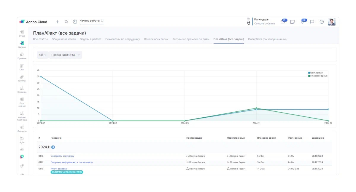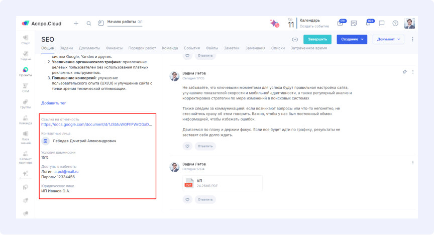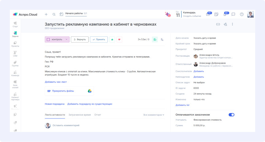 Коллектив из 15 специалистов включает экспертов по охватным инструментам, производственный отдел, менеджеров по продажам, PR-менеджера и бизнес-ассистента. Многие предприниматели откладывают внедрение CRM до момента, когда объем задач станет критическим. Руководитель Panda Ads выбрал противоположный подход. Это не первый проект, в котором я участвую. Соответственно, необходимость внедрения CRM, а не ведение задач в Excel, Telegram или Skype, была изначально. То есть когда мы только сидели у юриста, подавали документы на регистрацию юридического лица, уже понимали, что нам нужна CRM. Александр Гаврилин, CEO digital-агентства Panda Ads Изначально агентство работало в ПланФикс на протяжении шести лет. Система покрывала весь жизненный цикл взаимодействия с клиентами — от первого контакта до завершения сотрудничества. В ПланФиксе было все, вся жизнь бизнеса: от знакомства с клиентом до акта сверки при расторжении договора. Изначально мы просто пошли выбирать систему управления и остановились на ПланФикс. Несмотря на функциональность ПланФикс, команда столкнулась с серьезной проблемой — сложностью освоения системы новыми сотрудниками. Многие задачи в ПланФикс решались относительно сложно и долго. Плюс интерфейс системы, несмотря на все возможности кастомизации и регламенты, был достаточно сложным для понимания некоторыми членами команды. Особенно остро это ощущалось при найме специалистов без опыта работы в digital-сфере. Вместо концентрации на профессиональных задачах сотрудники тратили значительное время на изучение интерфейса системы. Важно, что человек видит в системе: «Создать действия в хронике» или «Написать комментарий в задаче». Суть одна и та же, но для новичков это более понятный язык, что сильно упрощает работу. При поиске альтернативного решения команда сосредоточилась на двух принципиальных требованиях: Для нас было критически важно вести финансы в той же системе, в которой мы ставим и выполняем задачи. В противном случае можно было бы легко потерять где-то какую-то сумму зачисления, какую-то цифру и так далее. В результате анализа различных платформ выбор пал на Аспро.Cloud. Процесс перехода оказался значительно проще ожидаемого благодаря возможности импорта данных из CSV. Мы перенесли всю информацию и перевели команду в Аспро.Cloud, наверное, за недели две. Но нужно тоже понимать, что мы занимались внедрением неполный рабочий день. Основная подготовительная работа заключалась в настройке пользовательских полей проектов для корректного импорта информации. Потенциальные клиенты обращаются в агентство через различные каналы: Интеграция с внешними каналами позволяет автоматически создавать карточки сделок в воронке продаж, избегая ручного ввода данных. Система объединяет всю историю взаимодействия с клиентом в единой карточке, что исключает дублирование контактов и потерю информации. Воронка продаж настроена с учетом специфики агентства и включает все необходимые этапы работы с потенциальными клиентами. Автодействия обеспечивают непрерывность процесса — при переходе сделки на новый этап ответственному менеджеру автоматически ставятся соответствующие задачи. По завершении сделки система автоматически инициирует передачу информации производственному отделу. После получения информации от отдела продаж специалисты создают от