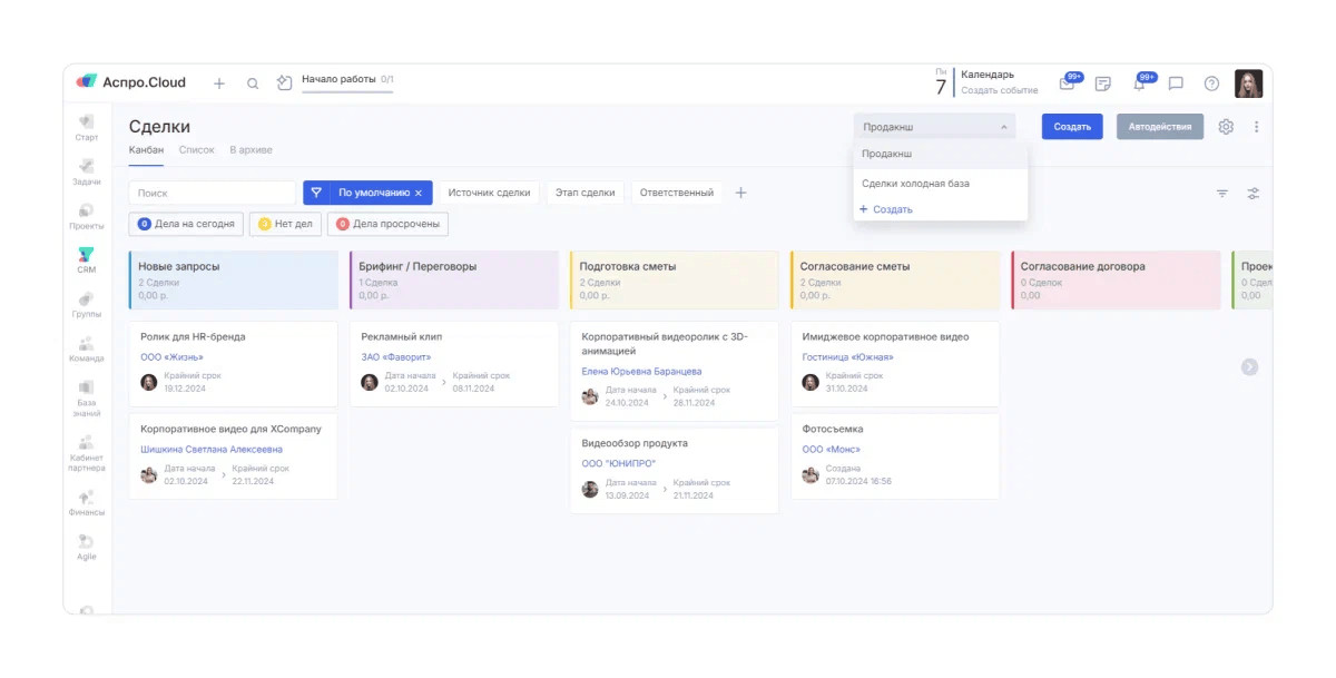 Продюсеры заносят сделки вручную — интеграция с почтой и IP-телефонией не подключена из-за специфики работы. Основная коммуникация с заказчиками происходит на встречах и в мессенджерах.
