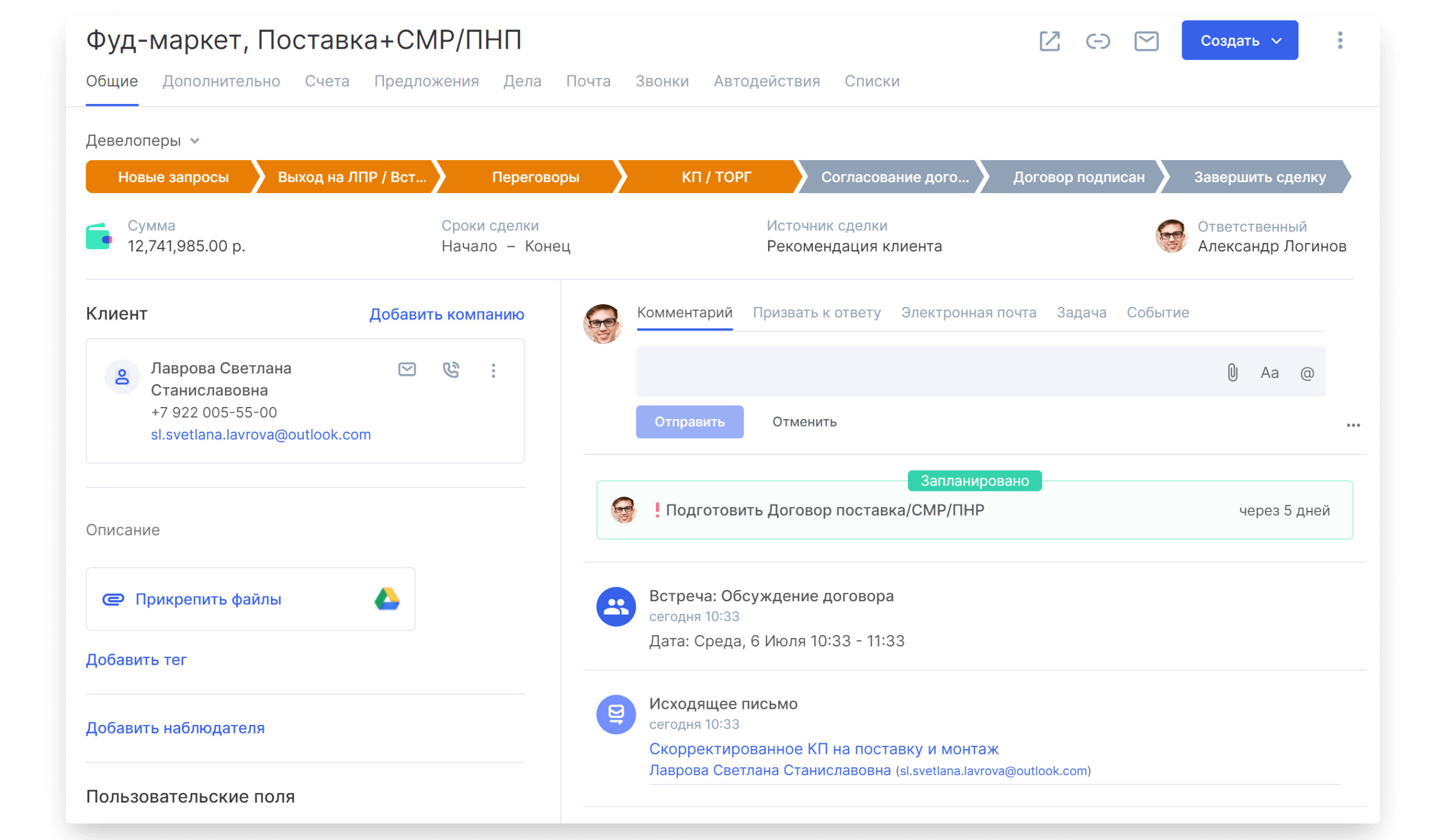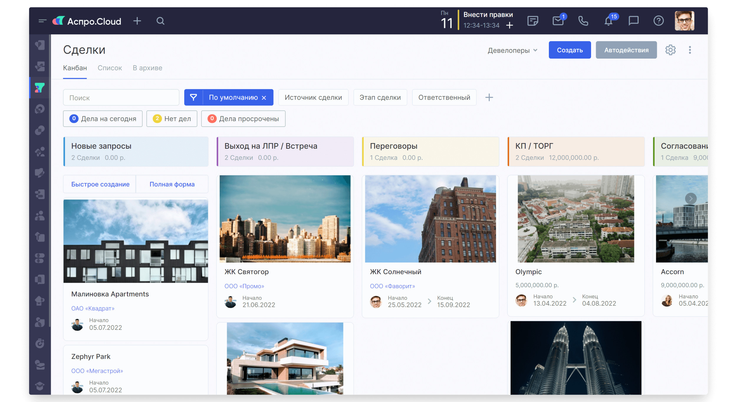 О существовании Аспро.Cloud команда узнала благодаря рекомендации известного урбаниста-блогера, который активно использовал систему в строительной деятельности. Обнаружив наличие модуля управления проектами и возможности расчета рентабельности, Сергей немедленно зарегистрировался для самостоятельного изучения функционала. Дополнительным преимуществом оказался модуль финансового управления. Поскольку руководитель студии работает удаленно из другого города, ему требовался оперативный доступ к информации о денежных потоках и взаимодействии с контрагентами без необходимости использования множественных сервисов. После поступления запроса от потенциального заказчика в системе формируется карточка сделки с детальным описанием: К каждой сделке добавляется визуализация будущего объекта для наглядности — архитекторы особенно ценят такой подход как творческие специалисты. В системе настроено несколько воронок продаж — отдельно для: В зависимости от воронки изменяется набор этапов, хотя многие из них повторяются. На этапе «Новые запросы» собираются необработанные лиды для первичного анализа — сбора данных и заполнения карточек контрагентов. Все контакты и организации четко классифицированы по категориям: Каждому контрагенту присваивается сфера деятельности, указываются контактные данные, а через пользовательские поля добавляется информация о днях рождения, увлечениях и интересах. Основная задача начального этапа — выявление всех лиц, принимающих решения в компании-заказчике. На следующем этапе устанавливается контакт с ключевыми лицами. Из карточки отправляется электронное письмо с презентацией услуг, планируется телефонный звонок для договоренности о встрече. Осуществление звонков непосредственно из карточки контакта обеспечивается интегрированной телефонией от Zadarma и Mango Office. Критически важным является этап переговоров, где происходит демонстрация визуализации проекта и сбор обратной связи. Последующие этапы включают: В проектной карточке наглядно отображается вся необходимая информация с четким отображением хода работ. К проекту прикрепляется: Для анализа планируемых и фактических показателей используется финансовое планирование в рамках проектов. Модуль «Финансы» отображает всю финансовую активность организации со счетами, актами и коммерческими предложениями, что значительно упрощает управление. Для всех сотрудников создана база знаний с проведением регулярного обучения персонала. В базе детально описаны: В настоящее время студия движется к полной оптимизации работы всех офисных сотрудников. До пандемии вся команда работала в офисе, теперь появились позиции: Компания больше не стремится содержать избыточные офисные площади, поскольку многие специалисты научились эффективно работать через интернет и предпочитают удаленный формат. Единая платформа позволяет вести все операции в едином интерфейсе: «Мне как владельцу необходимо постоянно контролировать все процессы. Работа в студии идет практически круглосуточно — продажники ведут переговоры, архитекторы выполняют проекты, а я не могу находиться в офисе 24 часа. При этом мне не нужно углубляться в детали, достаточно видеть общую картину движения дел», — делится Сергей Капустин. Теперь руководитель заходит в систему и мгновенн