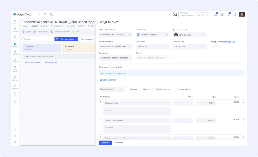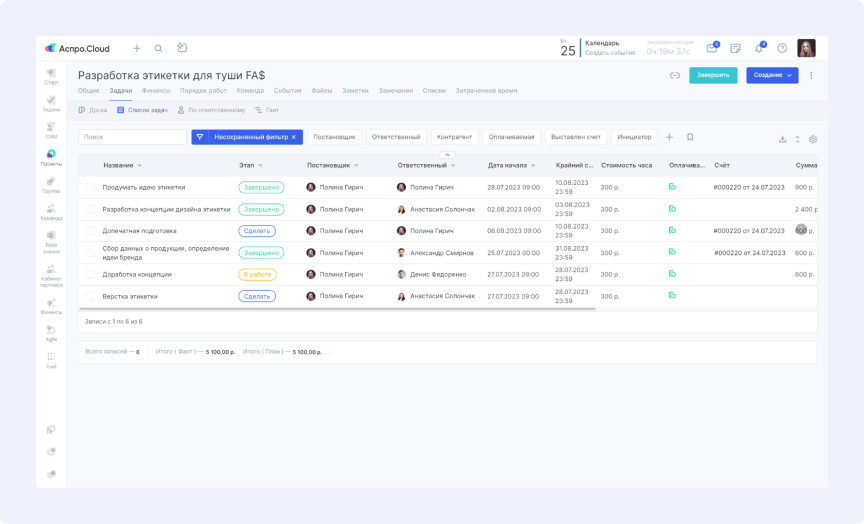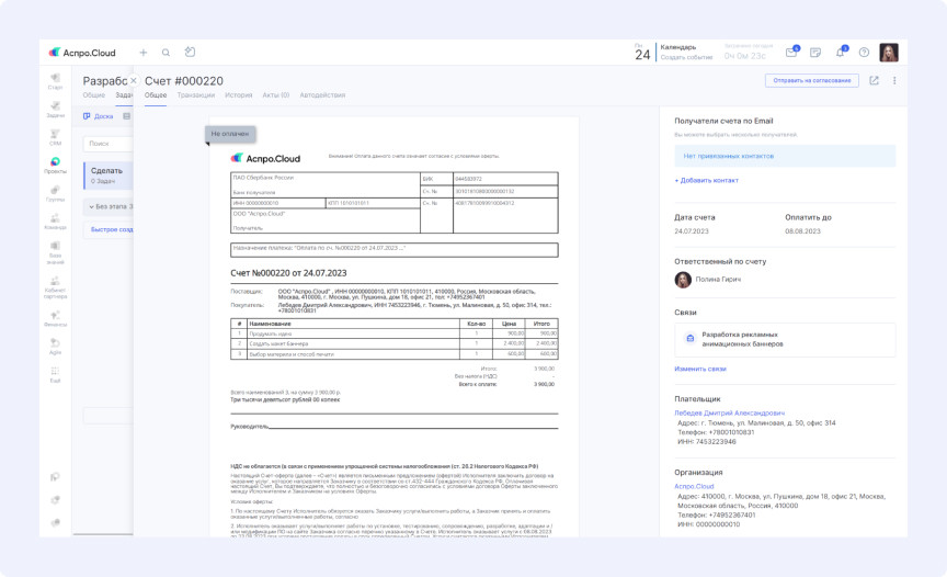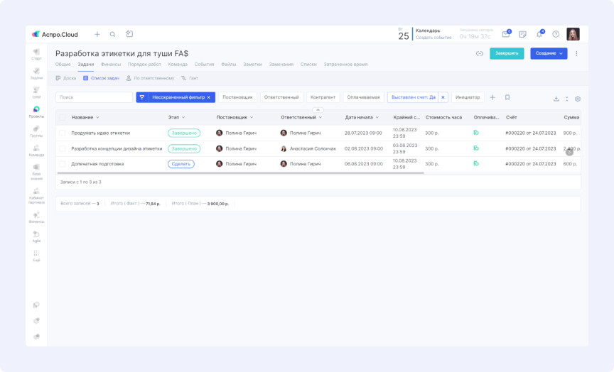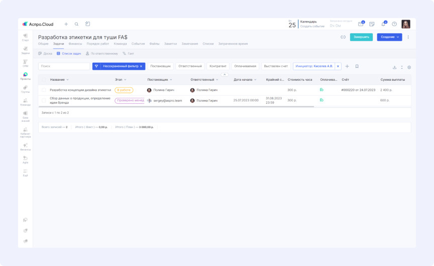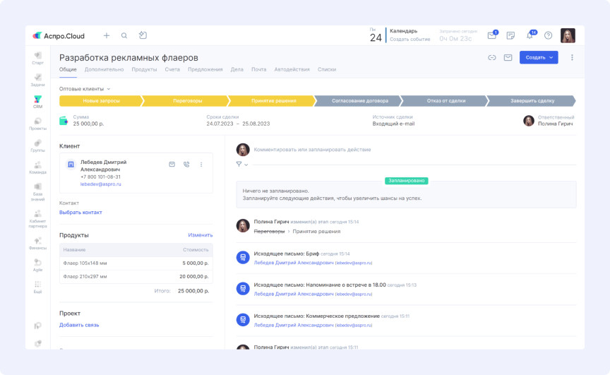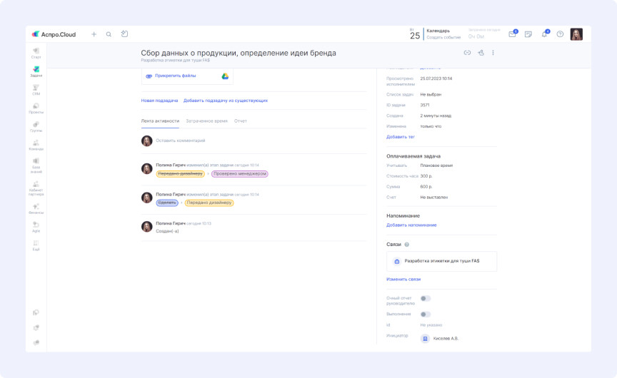 «Наши заказчики оплачивают не готовую продукцию по установленной цене, а время работы дизайнеров. У нас есть прайс с временными нормативами и ставками. Клиент платит за плановое время, переработки компенсируем мы. Поэтому критически важно понимать итоговую сумму по проекту и ее соответствие реальным показателям», — объясняет руководитель. Разработчики добавили в интерфейс задач поле «Сумма», позволяющее видеть стоимость отдельных задач и проектов в целом. Это дает возможность отслеживать расхождения между планируемой и фактической прибылью для последующего анализа причин. «Клиенты оплачивают только время создания продукта. Но есть внутренние процессы — например, проверка работы новичка наставником перед отправкой заказчику. Такие задачи учитываются в проекте, но не оплачиваются клиентом. Нам нужно было отслеживать их количество», — рассказывает руководитель. Специалисты создали фильтр в списке задач для просмотра оплачиваемых и неоплачиваемых работ по проектам или сотрудникам. «В проекте может быть множество задач. Вручную сложно отследить, по каким из них выставлены счета. А это критически важно — иначе дизайнеры могут остаться без зарплаты. Требовалась сводная информация по выставленным счетам», — поясняет руководитель. В списке задач появился дополнительный фильтр, позволяющий в один клик увидеть, по каким задачам счета уже отправлены, а по каким нет. Клиенты оплачивают выполненные работы еженедельно или ежемесячно на основе планового времени. Менеджер создает проект и настраивает параметры оплачиваемого времени для корректного расчета при выставлении счета. При формировании счета система автоматически рассчитывает стоимость выполненных работ за указанный период. Готовый документ отправляется заказчику в несколько кликов. В агентстве есть «инициаторы» — сотрудники компаний-заказчиков, которые ставят задачи. Менеджерам необходимо формировать отчеты по задачам и инициаторам для выставления счетов. Для решения этой задачи создали пользовательское поле с группой инициаторов. В каждой задаче можно выбрать инициатора, просмотреть его карточку и связаться при необходимости. Для формирования сводного отчета используется фильтр по инициаторам в списке задач, позволяющий отследить активность каждого из них. Руководителю важно анализировать эффективность команды, поскольку переработки оплачивает компания. Для предотвращения убытков необходимо понимать причины сложностей при выполнении задач. Используются отчеты по показателям сотрудников: Руководитель может отслеживать соблюдение планов уже на стадии выполнения задач с помощью специального отчета. Это позволяет своевременно выявлять и устранять проблемы. Агентство получает заявки исключительно по email. При большом потоке писем от разных отправителей легко пропустить заявку или потерять детали сделки. Каждый менеджер подключил свой почтовый ящик к системе. Теперь все поступающие заявки автоматически собираются в карточках клиентов с полной историей взаимодействия. Менеджер может изучить детали сделки и отправить ответ прямо из системы. «Аспро.Cloud мы применяем больше для планирования, чем как классическую CRM. Как руководителю, мне очень удобно контролировать работу команды: что было сделано вчера, что планируется сегодня. Это дает уверен