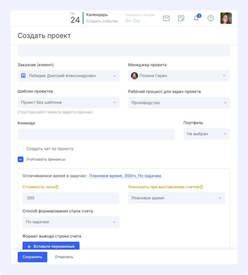 - Формирование счетов на основе затраченного времени