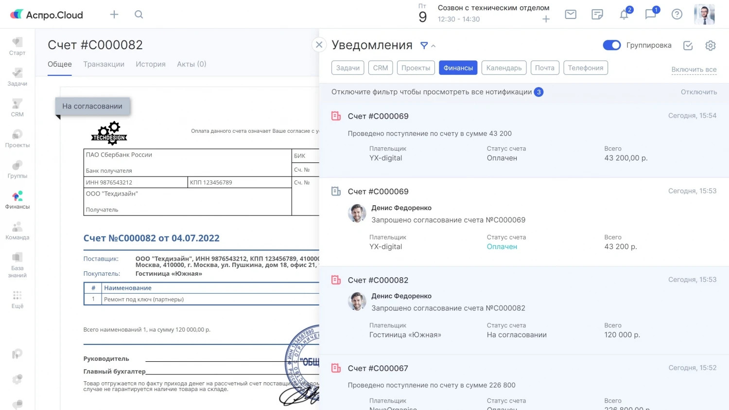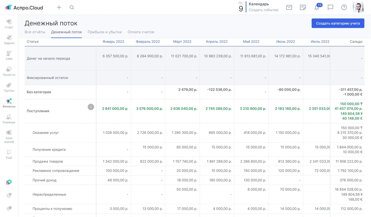 «Я не мог определить источник поступления, поэтому приходилось искать документ в одной системе, а затем вручную проставлять данные в другой. Если проект включал несколько услуг, платеж нужно было дополнительно разделять по статьям», — рассказывает Константин Султанов. Команда RANX приняла решение консолидировать финансовый учет и документооборот в рамках одной платформы. Появление необходимого функционала в Аспро.Cloud позволило отказаться от использования дополнительных сервисов. «Мы вернулись к Аспро.Cloud, когда в системе появились инструменты для работы с выручкой. Приятно видеть развитие платформы и появление востребованных возможностей. Для нас критически важно правильно интегрировать документооборот с финансовым учетом», — комментирует руководитель компании. Переход оказался относительно простым благодаря сохранившимся шаблонам документов. Потребовалось только настроить финансовый модуль и перенести учет в систему. Финансовые категории в системе структурированы по типам деятельности: операционная, инвестиционная и финансовая. Это обеспечивает корректное отражение реальной прибыльности бизнеса. «В настоящее время мы используем две системы параллельно, одна из которых — Аспро.Cloud. Это все еще не идеальный вариант, но финансы и документооборот теперь сосредоточены в одном месте. Рекомендую при выборе CRM-системы сразу учитывать все потребности бизнеса, поскольку миграция данных всегда сопряжена с трудностями. Обратите внимание на Аспро.Cloud: здесь есть финансовые инструменты, документооборот, управление проектами и полноценная CRM», — резюмирует Константин Султанов. Агентство RANX смогло автоматизировать финансовый контроль в единой рабочей среде. Теперь команда создает документы и отслеживает поступления в одной системе, которая автоматически формирует отчетность и показывает реальную картину доходности. Это позволяет руководству оперативно реагировать на отклонения от плановых показателей. Ключевые результаты: Покажем все возможности Аспро.Cloud для вашего бизнеса Запишитесь на бесплатную демонстрацию системы от наших экспертов. Проведем короткую онлайн-встречу и покажем, как Аспро.Cloud поможет автоматизировать процессы и повысить эффективность именно в вашем бизнесе.