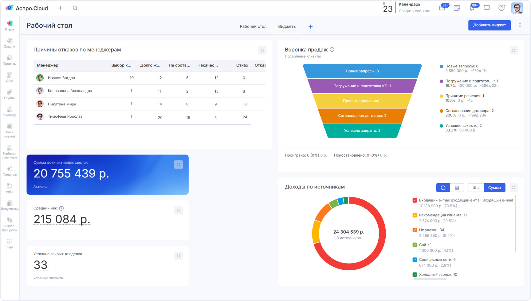 Расхождения с контрагентами могут копиться месяцами. Когда проблема становится очевидной, исправить ее уже сложно. Регулярная сверка позволяет вовремя выявлять ошибки и возвращать деньги в оборот без конфликтов. Обязательства по кредитам часто учитываются неполно. Проценты смешиваются с основным долгом, платежи забываются, а планирование искажается. Это создает риски для финансовой устойчивости бизнеса. • видеть полную картину долгов; • планировать платежи заранее; • избегать кассовых разрывов; • принимать взвешенные решения. Даже при полном учете доходов и расходов бизнес может терять деньги. Причина — отсутствие анализа и фокуса на ключевых показателях. Руководителю важно понимать, какие метрики действительно отражают состояние компании. • выявлять финансовые риски заранее; • перестать пересчитывать отчеты вручную; • контролировать несколько направлений одновременно; • сохранять управляемость при росте. Контроль продаж часто превращается в крайности: либо жесткий надзор, либо полное отсутствие прозрачности. В обоих случаях страдает результат. Менеджеры теряют мотивацию, а руководитель узнает о проблемах слишком поздно. Прозрачная аналитика позволяет видеть процесс продаж в динамике и принимать решения без давления на команду. Рутина съедает время и снижает качество работы. Согласования, задачи и документы накапливаются, ошибки становятся неизбежными. Автоматизация таких процессов освобождает ресурсы для стратегических задач. Отпуска, больничные и удаленная работа часто оформляются вручную. Информация теряется, согласования затягиваются, а команда узнает об отсутствии коллег слишком поздно. Автоматизация позволяет сделать процесс прозрачным и управляемым. Постановка задач отнимает много времени, особенно при высокой нагрузке. Голосовое создание задач помогает фиксировать идеи сразу и снижает потери времени в течение дня. Ежедневно и руководители, и рядовые сотрудники тратят значительное время на рутину. Первые вынуждены разбирать многочасовые записи переговоров, систематизировать обширные данные и искать в них закономерности. Вторые — составлять схожие коммерческие предложения, писать итоги встреч и разбирать отзывы клиентов. Эта рутина снижает общее качество работы и оставляет мало пространства для решения стратегических вопросов. Изменить ситуацию позволяет автоматизация на основе искусственного интеллекта. Мы внедрили ИИ-агента, который оценивает демовстречи по заданным параметрам, формирует их краткие итоги и готовит индивидуальные рекомендации для клиентов. Процесс аналитики демо-встреч Аспро.Cloud с помощью искусственного интеллекта Благодаря автоматизации удалось достичь конкретных результатов: Если же вы давно планируете автоматизацию, но не знаете, с чего начать, или не хватает ресурсов, мы готовы помочь. В 2025 году мы запустили услугу «Внедрение ИИ». Наши эксперты реализуют любой ваш сценарий: автоматизируют оценку работы команды, анализ проектов или корпоративное обучение. Это позволит ускорить процессы, высвободить время для стратегии и повысить прибыль. Изменения налогового законодательства требуют подготовки. Без пересмотра процессов бизнес рискует потерять прибыль и столкнуться с доначислениями. Важно заранее проверить документы и выстроить работу по новым прав