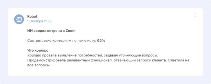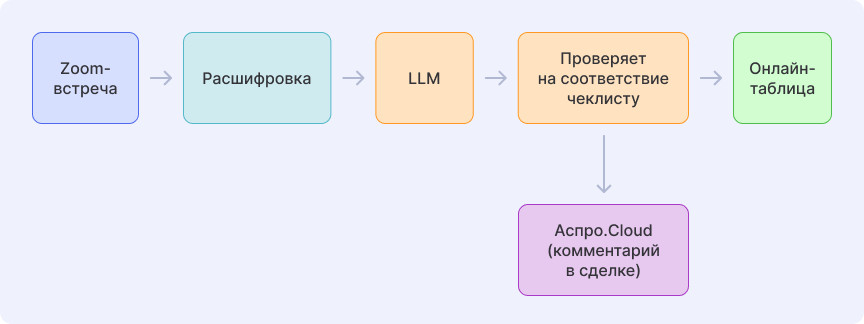 В качестве исходных данных использовали транскрибацию Zoom — сервис формирует ее автоматически. Расшифровка передается в LLM. Языковая модель получает чеклист из 16 критериев и: В таблице фиксируются: Таким образом, у нас появляется база для аналитики и построения сводных отчетов. Дополнительно LLM отправляет данные в Аспро.Cloud в виде комментария к сделке. В нем содержатся: По сути, вся информация по встрече сразу оказывается в системе. Мы понимали, что ИИ нужно откалибровать. Поэтому на первом этапе вели две параллельные таблицы: Это позволило сравнить результаты и донастроить промпт. Изначально модель была слишком лояльной и ставила баллы там, где руководитель их бы не поставил. После корректировок удалось добиться совпадения оценок и получить объективную картину. Важно: при любой автоматизации на базе ИИ необходимо проводить первичную проверку и периодический контроль. Параллельно мы настроили отчеты по выставленным счетам. Они автоматически отправляются в Telegram исполнительному директору и руководителям подразделений. Это усилило прозрачность финансовых показателей и сократило время на сбор информации. Текущая версия — первая итерация. Мы уже определили направления развития: После внедрения ИИ-агента:
