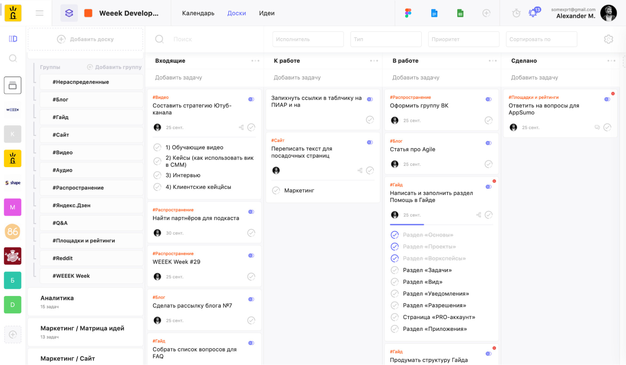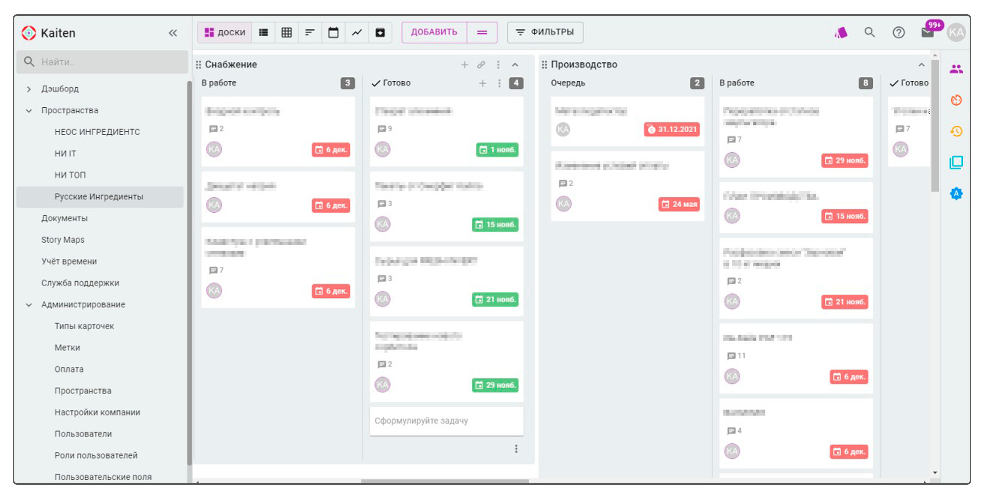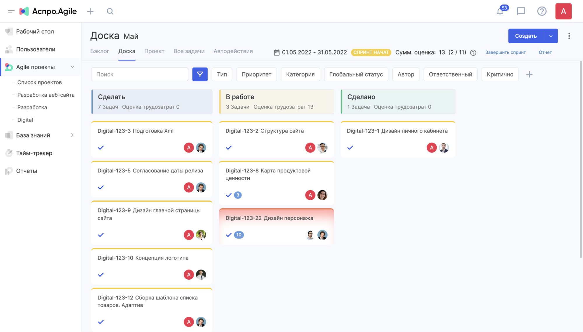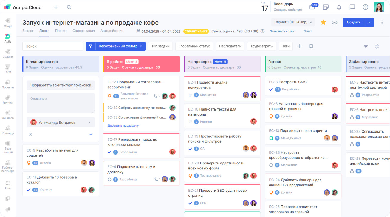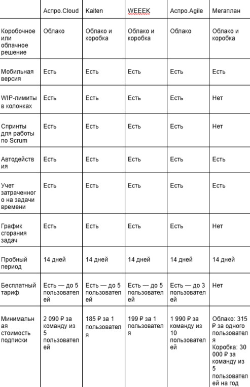 Аспро.Cloud открывает подборку как комплексная облачная система для управления бизнесом. Это не просто канбан доска, а платформа, где можно организовать работу с задачами, проектами, клиентами и финансами в одном интерфейсе. Сервис подходит для системной организации процессов — от постановки задачи до анализа эффективности команды. Функционал Канбан-доска в Аспро.Cloud помогает: Есть бесплатный тестовый период 14 дней с полным доступом ко всем возможностям. После тестирования можно перейти на бесплатный тариф с базовыми функциями — постановкой задач, комментариями и трекингом времени. Платные тарифы расширяют функциональность. Стоимость начинается от 2 090 ₽ в месяц за 5 пользователей. Подходит малому и среднему бизнесу, которому важно управлять задачами, проектами и загрузкой команды в единой системе. Kaiten — российский сервис для управления задачами и проектами с акцентом на гибкие методологии. Подходит для компаний, которые хотят выстроить прозрачный поток работы и контролировать производственные метрики. Рабочее пространство позволяет внедрять канбан с полноценной настройкой лимитов и аналитикой этапов. Канбан-доска в Kaiten позволяет бизнесу: Минимальный тариф — от 185 ₽ за пользователя. Есть бесплатный вариант с ограничениями по количеству сотрудников и досок. Полный функционал доступен в демо-режиме 14 дней. Подходит для личной работы, небольших команд и крупных компаний, которые внедряют канбан подход. WEEEK — виртуальный офис, который объединяет планировщик, канбан доску и CRM-систему. Решение подходит как для индивидуальной работы, так и для командного взаимодействия внутри проектов. Канбан-доска отображает этапы работы в колонках, а задачи — в карточках, что позволяет быстро оценить текущее состояние проекта. Задачи в WEEEK можно отображать в формате доски. Сервис позволяет: Новые пользователи получают 14 дней бесплатного доступа к максимальному тарифу. Затем можно выбрать бесплатный план с ограничениями по количеству пользователей и проектов или платную подписку — от 199 ₽ за одного человека. Подходит для фрилансеров, стартапов, небольших команд и компаний, в том числе IT-отделов, которым важно сочетать планирование задач и работу с клиентами. Аспро.Agile — российская система для проектного менеджмента, ориентированная на работу по гибким методологиям. Сервис помогает не просто визуализировать задачи на доске, а выстроить полноценный цикл управления проектами: от формирования бэклога до анализа производительности команды и план-факт показателей. Инструмент подходит для команд, которым важно планировать нагрузку, контролировать промежуточные результаты и видеть реальную картину по срокам и объему работы. На доске можно создавать любое количество колонок и адаптировать структуру под специфику проекта или отдела. Канбан-доска в Аспро.Agile позволяет: В Аспро.Agile есть бесплатный тариф, который подойдет для личного планирования или небольшой команды до 3 человек. Он позволяет работать с базовым функционалом и протестировать подход к управлению задачами. Если проектов и участников больше, потребуется платная подписка. Стоимость тарифов начинается от 1 990 ₽ за команду из 10 человек. В рамках платных планов открывается расширенный функционал по аналитике, управлению спринтами и контролю загрузки. Чтобы подробнее познако