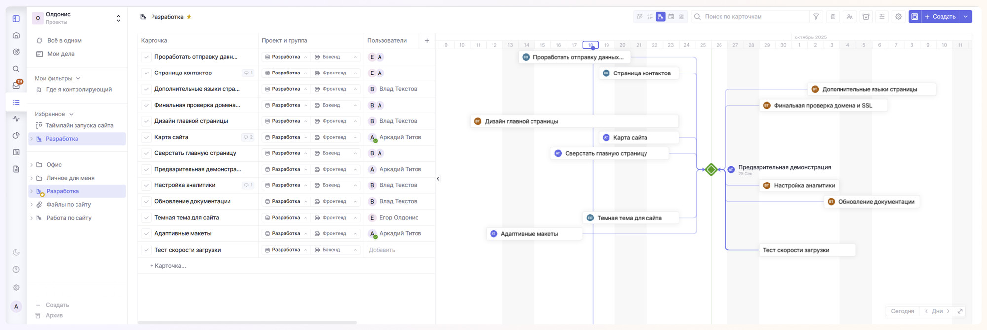 - Быстро обновлять план. Если даты изменяются, система автоматически пересчитает сроки связанных задач. Актуальный план всегда перед глазами.