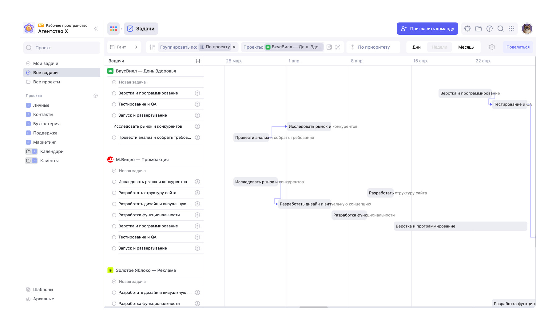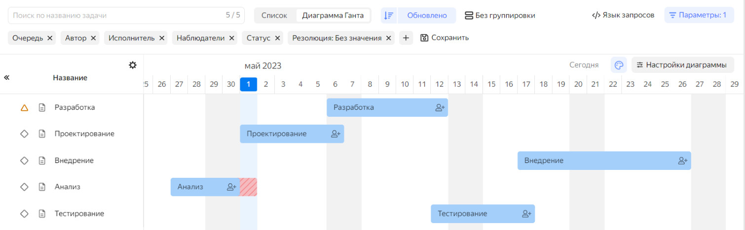 Shtab — облачная платформа для управления проектами, которая включает диаграмму Ганта, таск-трекер, отчеты и дашборды для контроля эффективности работы команды. Shtab помогает сотрудникам: Условия использованияТестовый период: 14 днейБесплатный тариф: есть, диаграмма доступна только на платной подпискеСтоимость: от 448 ₽ за 1 пользователяЦена актуальна на момент публикации GanttPRO — сервис для управления временем, исполнителями и бюджетом проекта. GanttPRO позволяет: Условия использованияТестовый период: 14 днейБесплатный тариф: нетСтоимость: от 8 $, то есть 630 ₽ за 1 пользователяСтоимость и курс актуальны на момент публикации WEEEK — российский облачный сервис для проектного менеджмента с диаграммой Ганта. WEEEK помогает: Условия использованияТестовый период: 14 днейБесплатный тариф: есть, ограничение — не более 5 сотрудниковСтоимость: от 159 ₽ за 1 пользователяЦена актуальна на момент публикации Яндекс Трекер — сервис командной работы в пакете Яндекс 360, дополняется корпоративной почтой, базой знаний и мессенджером. Яндекс Трекер позволяет: Условия использованияТестовый период: 14 днейБесплатный тариф: нетСтоимость: от 569 ₽ за 1 пользователяЦена актуальна на момент публикации Можно ли построить диаграмму в Excel? Да, но это сложнее, чем в специализированных сервисах. В Excel нет интерактивного редактора, автопостроения или поиска критического пути. Отслеживать выполнение задач придется вручную. Такой вариант подходит для небольших команд с 1–2 заказами, но не для крупных проектов. Запишитесь на онлайн-демонстрацию и протестируйте функции. Это бесплатно и позволяет оценить интерфейс и весь функционал. Используйте диаграмму Ганта для планирования и контроля рабочего времени. Лучшие сервисы предлагают интерактивные редакторы, автоматическое планирование и управление зависимостями. Автоматизация делает работу с инструментом простой, быстрой и эффективной. Чтобы софт подошел команде, протестируйте его функционал на демо-периоде.