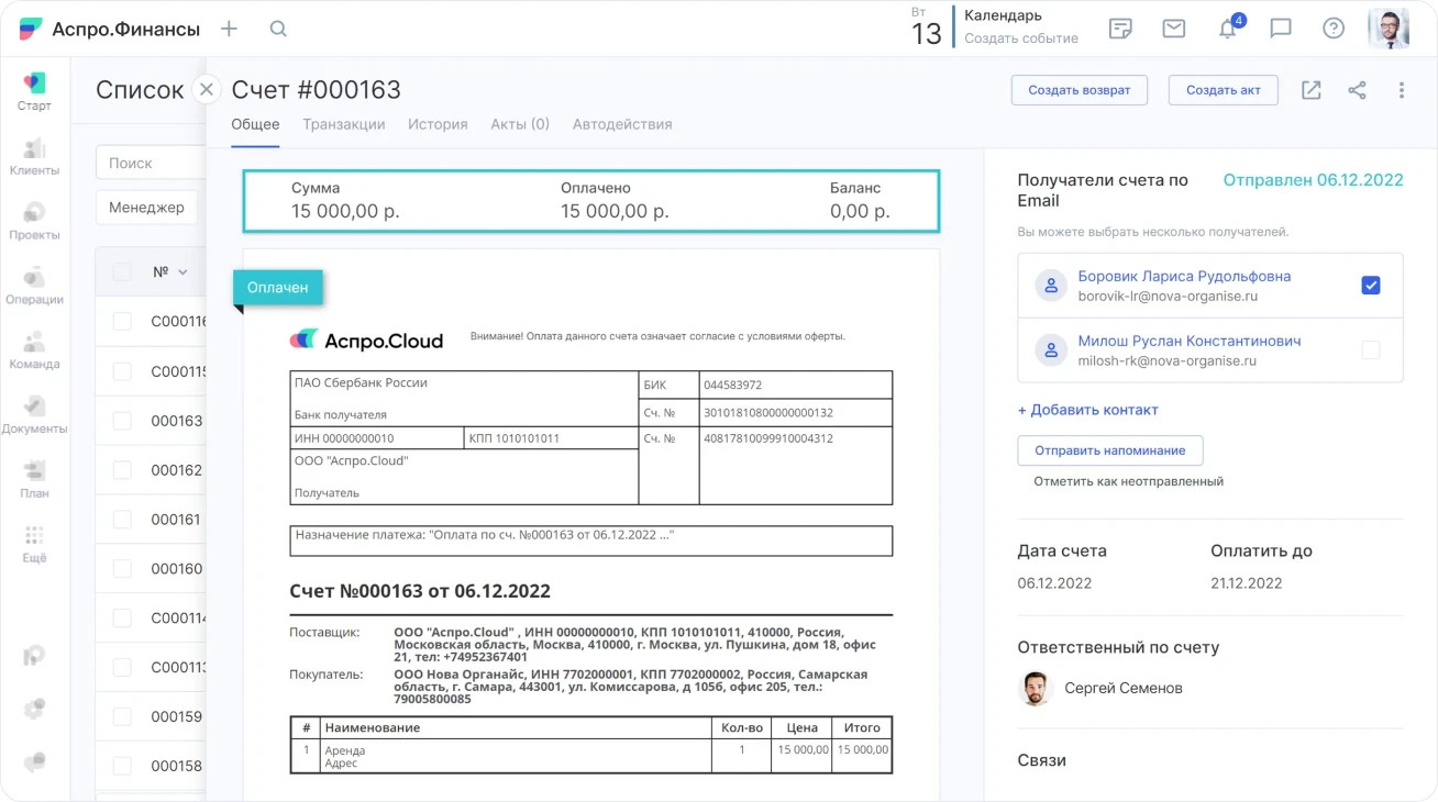 Чтобы хоть как-то объединить данные, пришлось подключать 1С:Бухгалтерию как связующее звено. В результате: На выставление одного счета уходило до 4 минут. После его отправки нужно было вручную находить платеж, заносить его в систему учета, распределять по статьям дохода. Если в счете были несколько услуг — процесс затягивался еще сильнее. 1. Оценка системы Команда изучила функционал Аспро.Финансы и убедилась: все нужное — уже внутри. 2. Быстрый перенос процессов Внедрение прошло безболезненно. Теперь и финансовое планирование, и выставление документов — в одном месте. 3. Новая скорость работы Формирование и отправка счета с актом теперь занимает не больше минуты. Проектный менеджер может сразу увидеть статус оплаты и напомнить клиенту при необходимости. 4. Уход от ручного труда Все транзакции автоматически попадают в нужные статьи. Не нужно больше искать платежи, распределять вручную или сверяться с 1С. Ручное выставление счетов через несколько сервисов отнимает часы и приводит к ошибкам. Автоматизируйте финансовые процессы в единой системе, чтобы выставлять документы в разы быстрее. Начните бесплатно — зарегистрируйтесь в Аспро.Финансы и получите полный доступ на 14 дней.