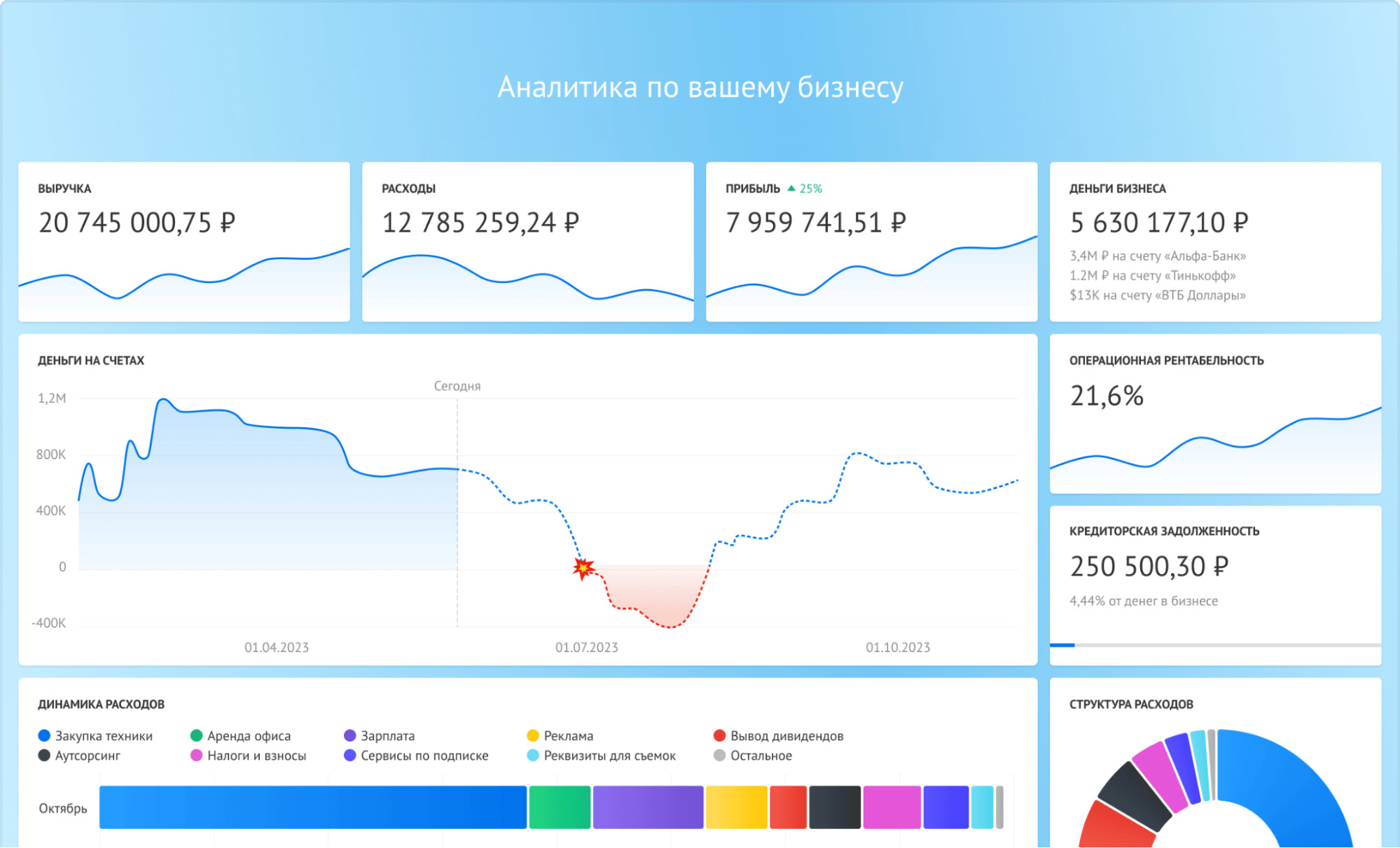 Именно эту задачу решают сервисы финансового учета. Они автоматически собирают данные из банков, CRM и других систем, формируют целостную картину бизнеса в режиме реального времени. С их помощью можно быстро увидеть, куда уходят деньги, какие проекты приносят прибыль и где есть риски кассовых разрывов. Мы собрали пять надежных решений. Они помогут упорядочить финансы и повысить прозрачность управления.