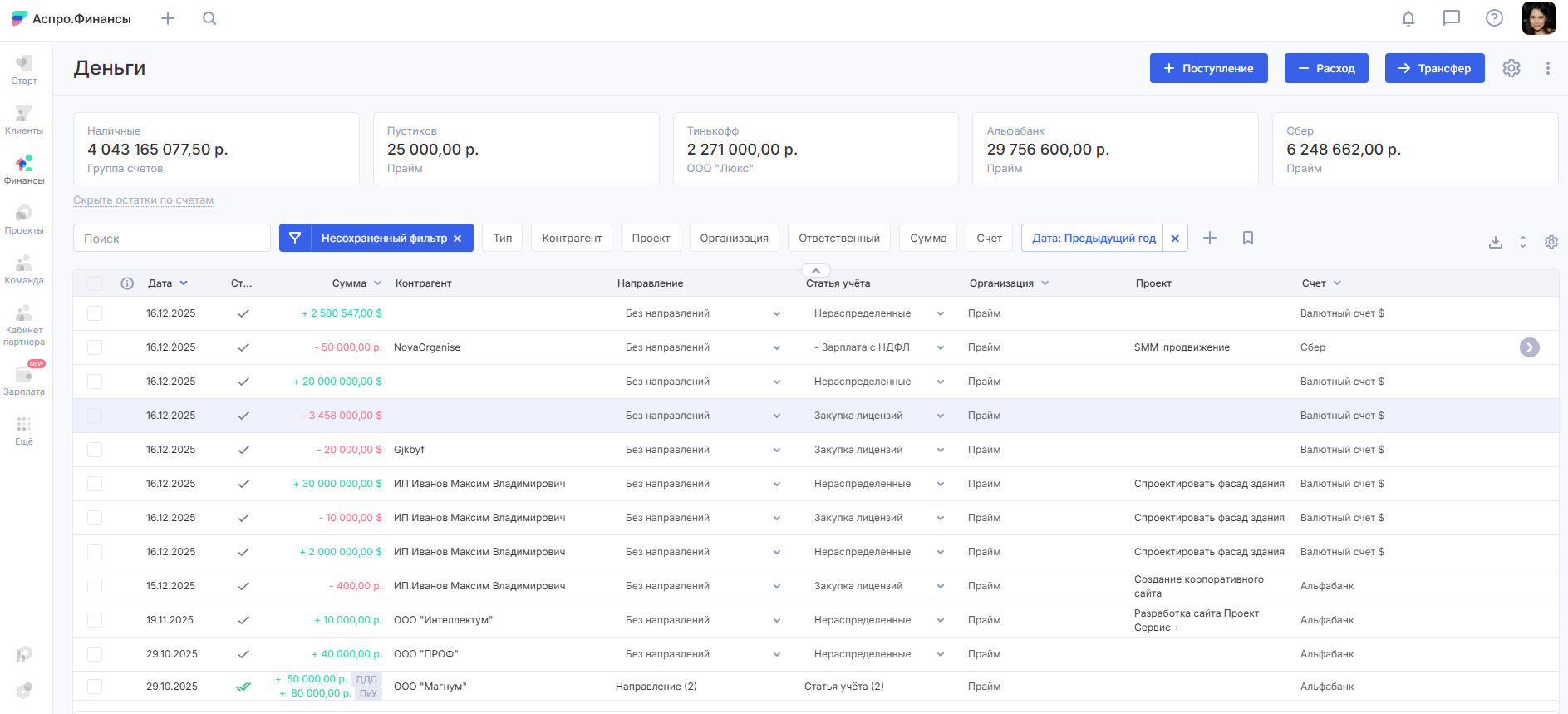- Раздел «Деньги». Все счета компании отображаются в одном окне. Данные загружаются автоматически или вручную, видны реестр операций и актуальные остатки в реальном времени.