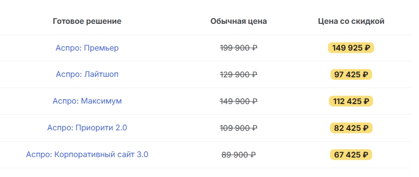 Остались вопросы? С удовольствием проконсультируем подробнее о возможностях готового решения через менеджера. Пишите в онлайн-чат или на почту: info@aspro.ru. Составим индивидуальный план запуска, расскажем о скидках.